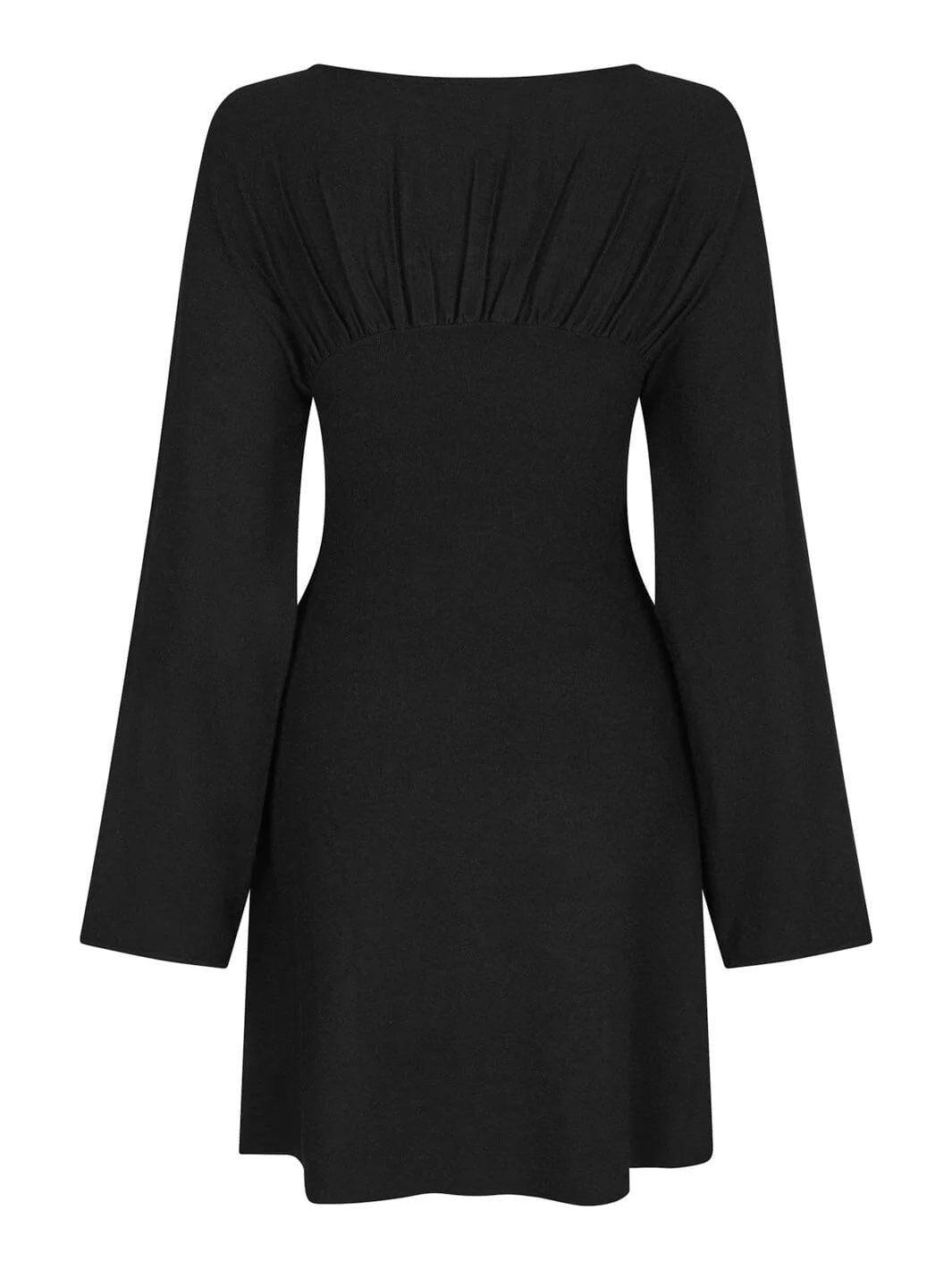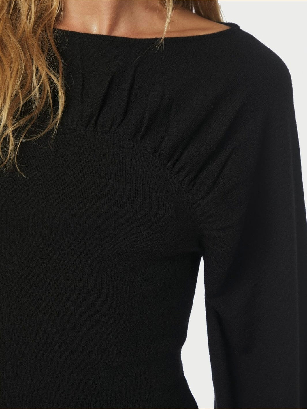 Holla Knit Dress fra Neo Noir. En elegant sort strikkekjole med rund hals og tettsittende overdel. Kjolen har rynkedetaljer på bryst og rygg som gir en flatterende fasong, og de lange, boxy ermene skaper en fin balanse til det ettersittende snittet. Skjørtet er lett utsvingt og har lårlang lengde, perfekt til både hverdag og penere anledninger.