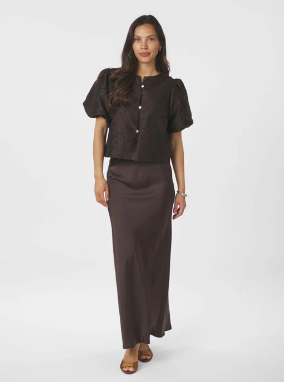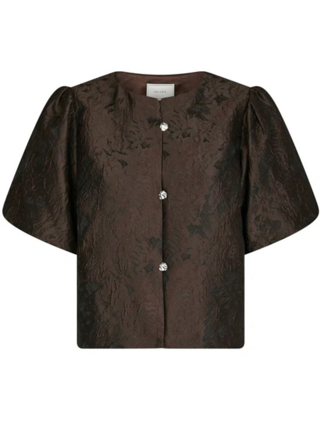 Elegant bluse fra Neo Noir med et vakkert brokademønster i trendy sjokoladebrun. Aisa Brocade Blouse har rund hals, korte puffermer og dekorative knapper langs fronten. Blusen har en kort, rett passform og styles like fint til bukser som skjørt.
