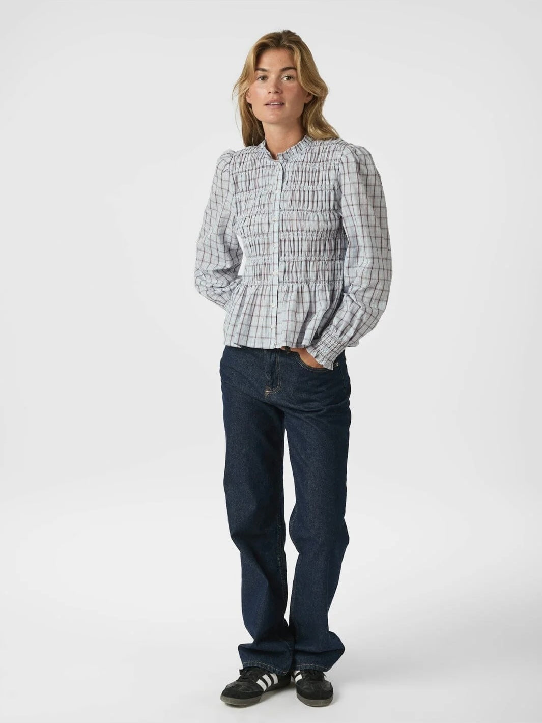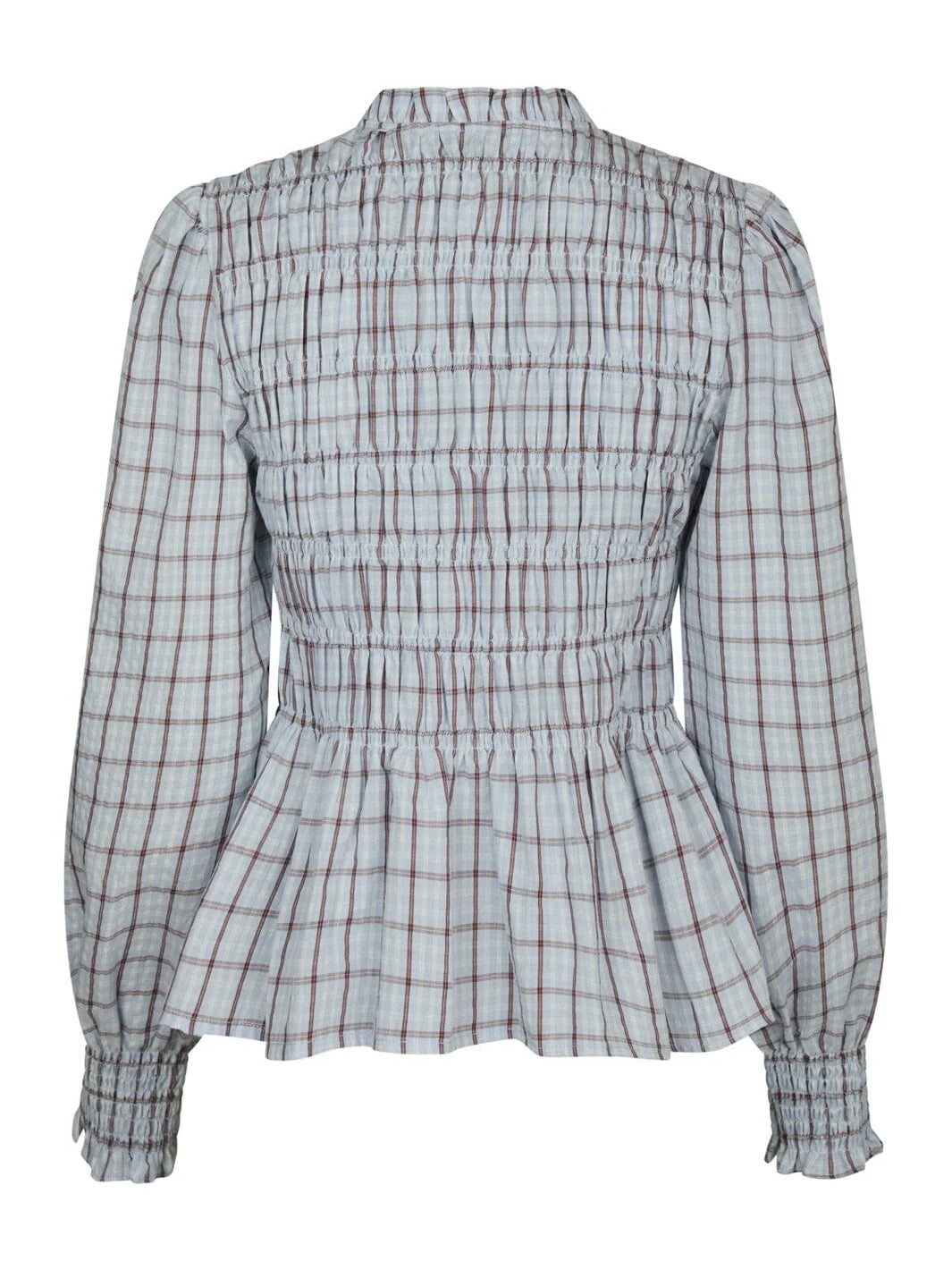 Lyseblå lekker bomullsbluse fra Neo Noir med rutete mønster og pemplum effekt. Blusen har smock-detaljer og en høy hals med knappelukking.