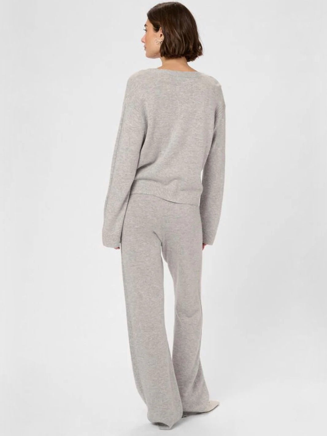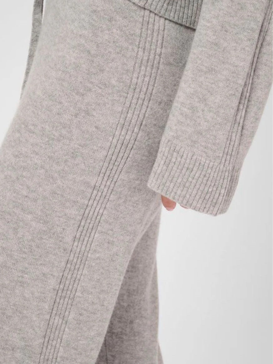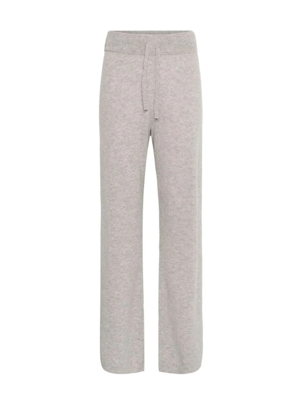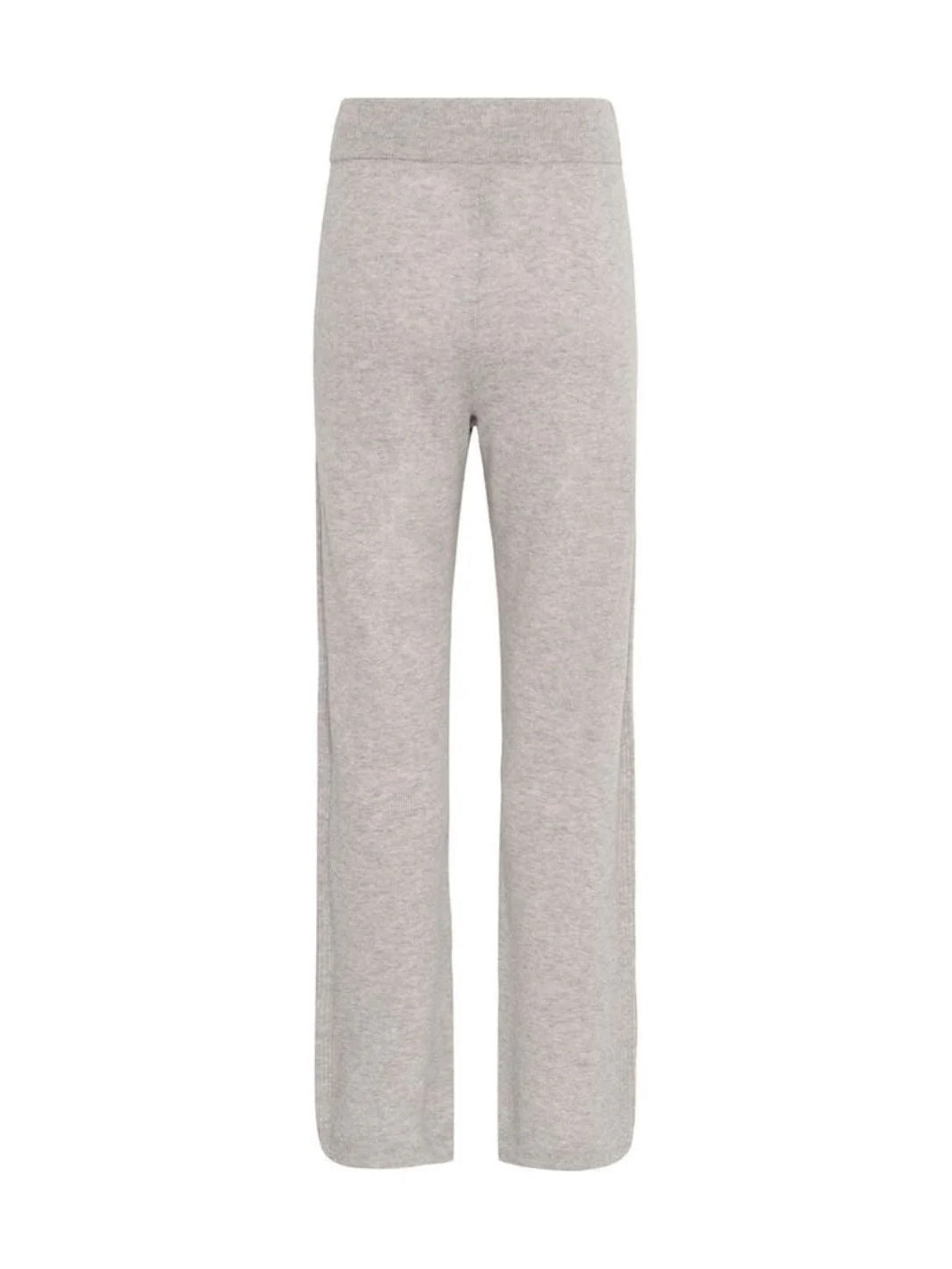 Culture Bianca Arrow Pants Grey Melange fra Culture. Behagelige og stilrene strikkebukser i en myk grå melange. Buksen har ribbede paneler langs bena som skaper et slankt og moderne uttrykk, samtidig som passformen er komfortabel med elastisk midje og rette ben. Et perfekt baseplagg til vintergarderoben, og ekstra fin sammen med Bianca Arrow Pullover for et komplett sett.