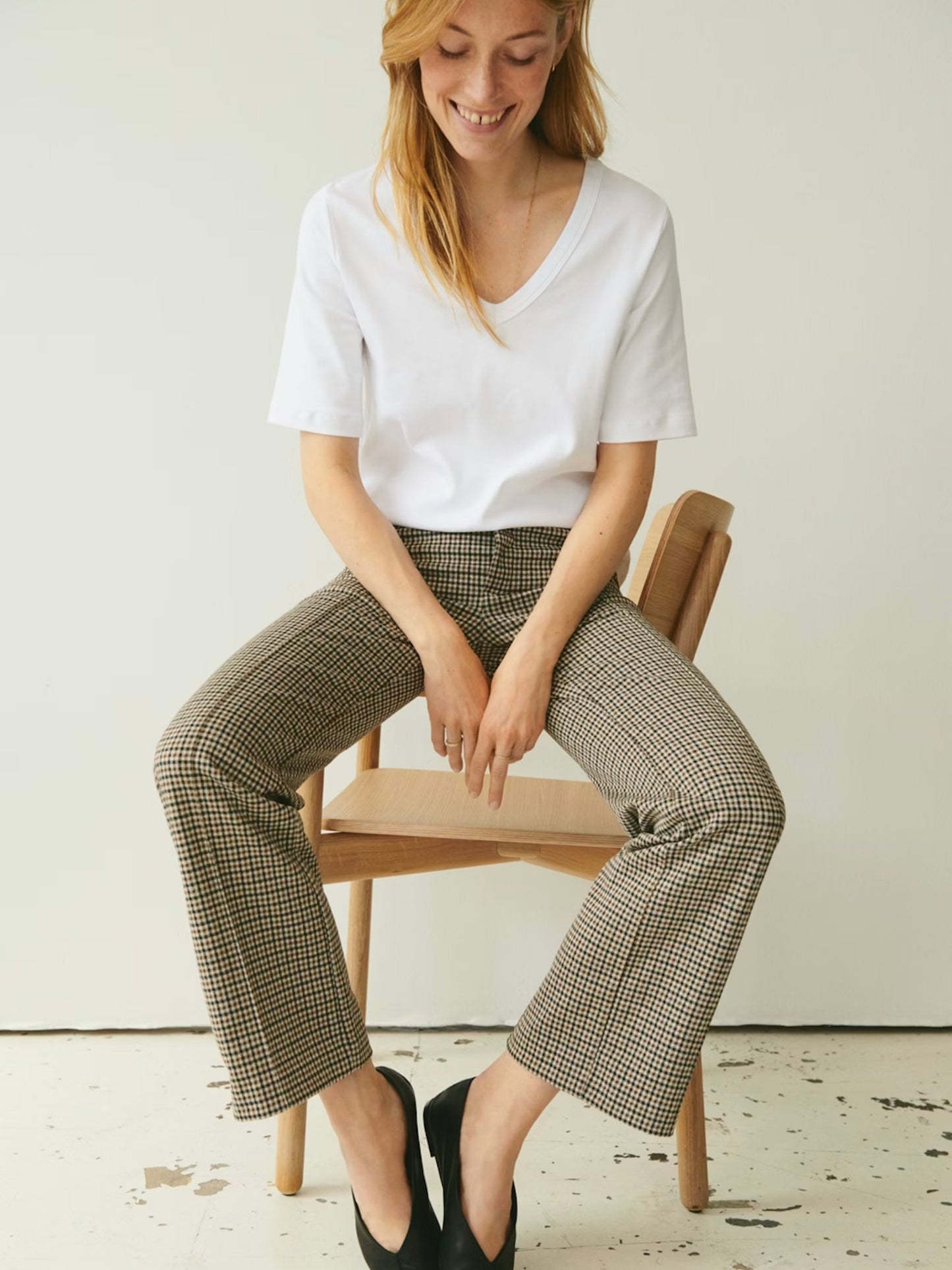 PontasPW PA Toasted Coconut Check fra Part Two er de ultimate buksene for deg som ønsker en stilfull hverdag. Buksene har en løs passform, med en late flare i enden, noe som gjør dem både komfortable og stilige. Den har en smigrende ankel-lengde, og er de perfekte buksene for både hverdag og mer formelle anledninger. Style dem med en blazer for en profesjonell look til kontoret, eller med enkelt t-skjorte for en avslappet, men trendy hverdagslook.
