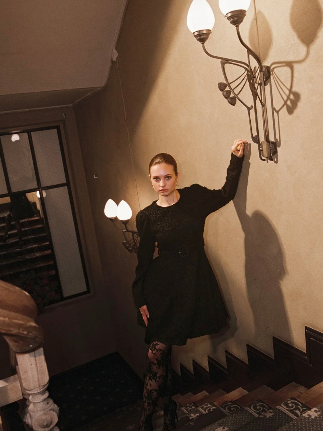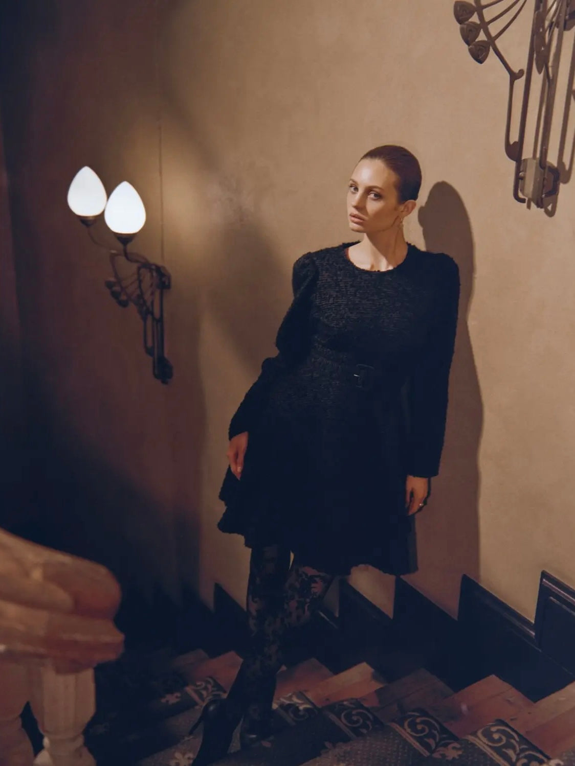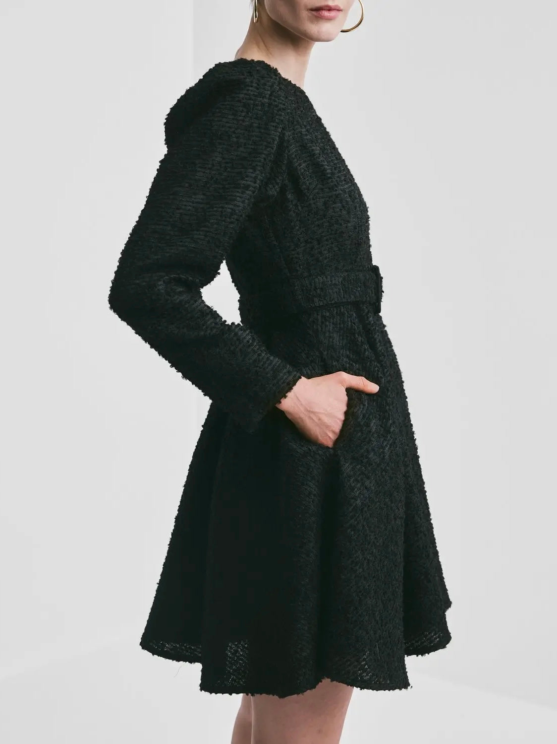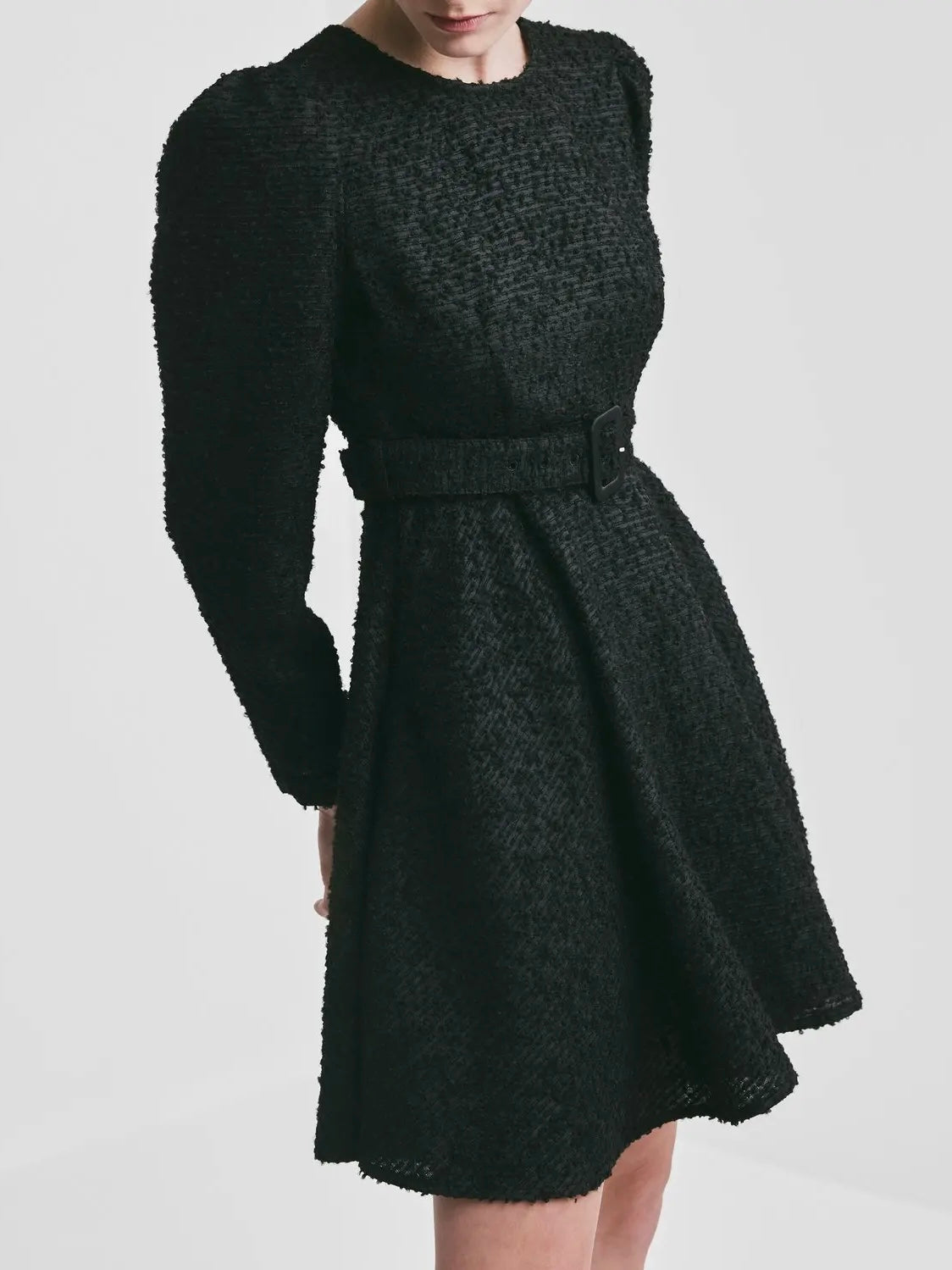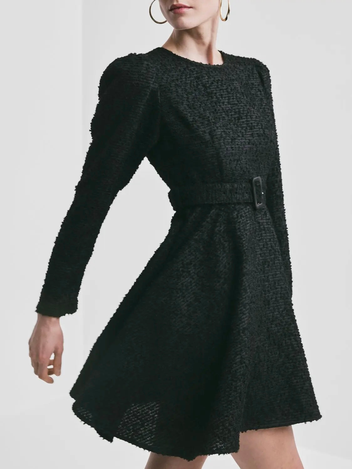 Boucle Belt Dress fra byTiMo er en feminin og elegant minikjole i klassisk bouclé-utførelse og sort farge. Kjolen har rund hals, lange puffermer og markert liv med belte. Utsving i skjørtet og stikklommer i sidene.
