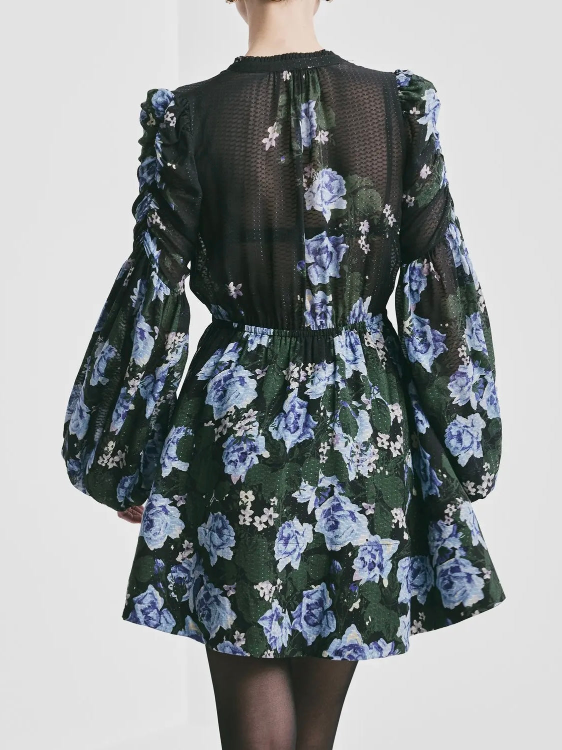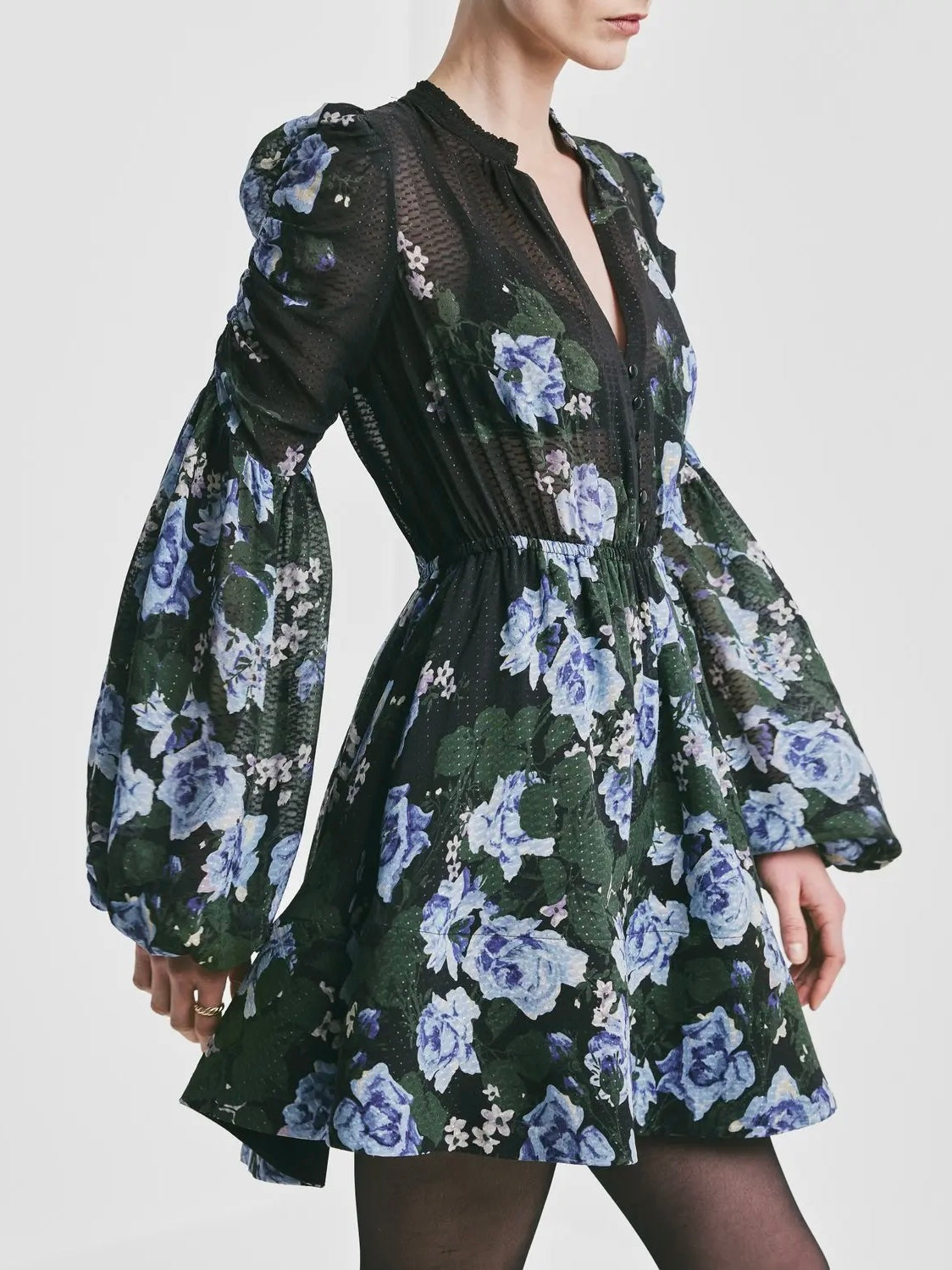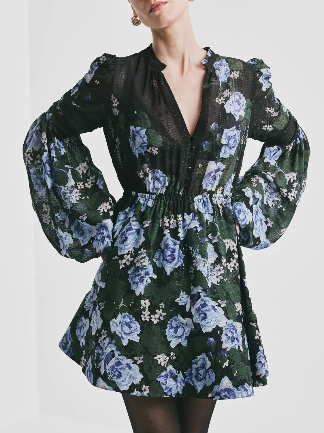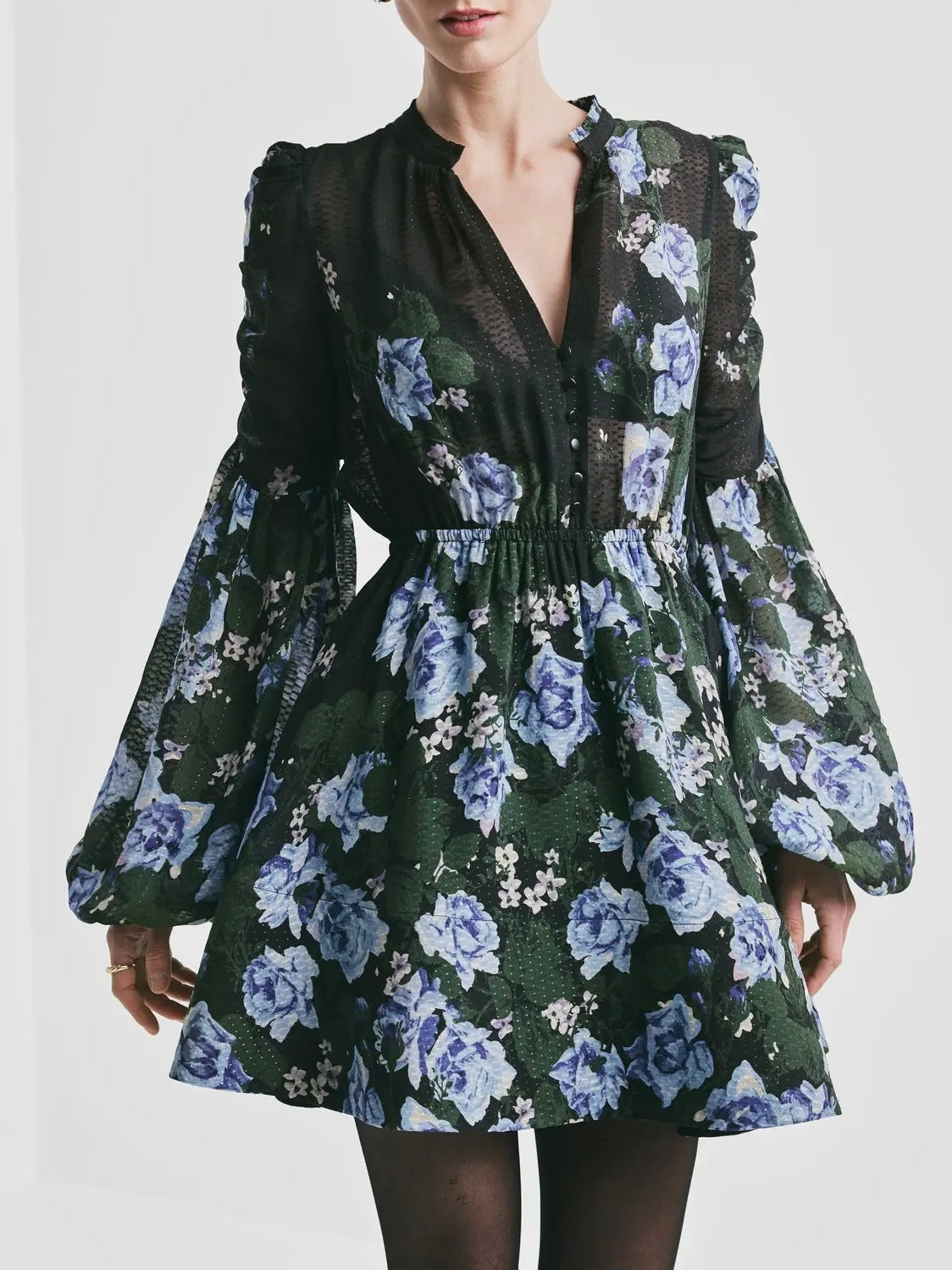 Georgette V-Neck Dress er en elegant kjole fra ByTimo som passer perfekt til festlige anledninger. Den sorte bunnfargen kombinert med det blå og grønne blomsterprintet gir en feminim touch. Kjolen har mini-lengde, V-hals med knapper nedover, et A-linjeskjørt og lange, voluminøse ermer med elastiske mansjetter. Den markerte midjen blir fremhvet med elastisk strikk bak i ryggen. Lukkes med skjult glidelås på siden. Style den med et par øredobber og fine pumps for en elegant look.