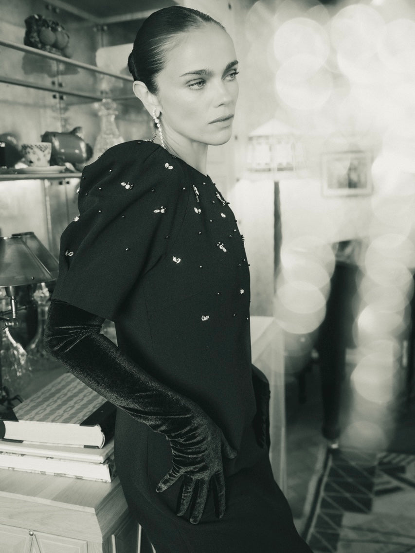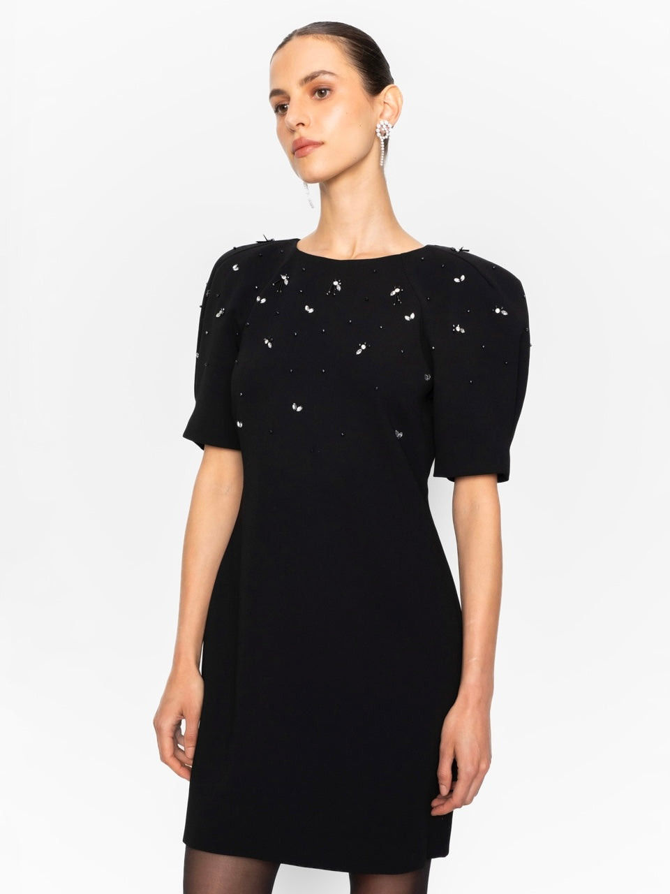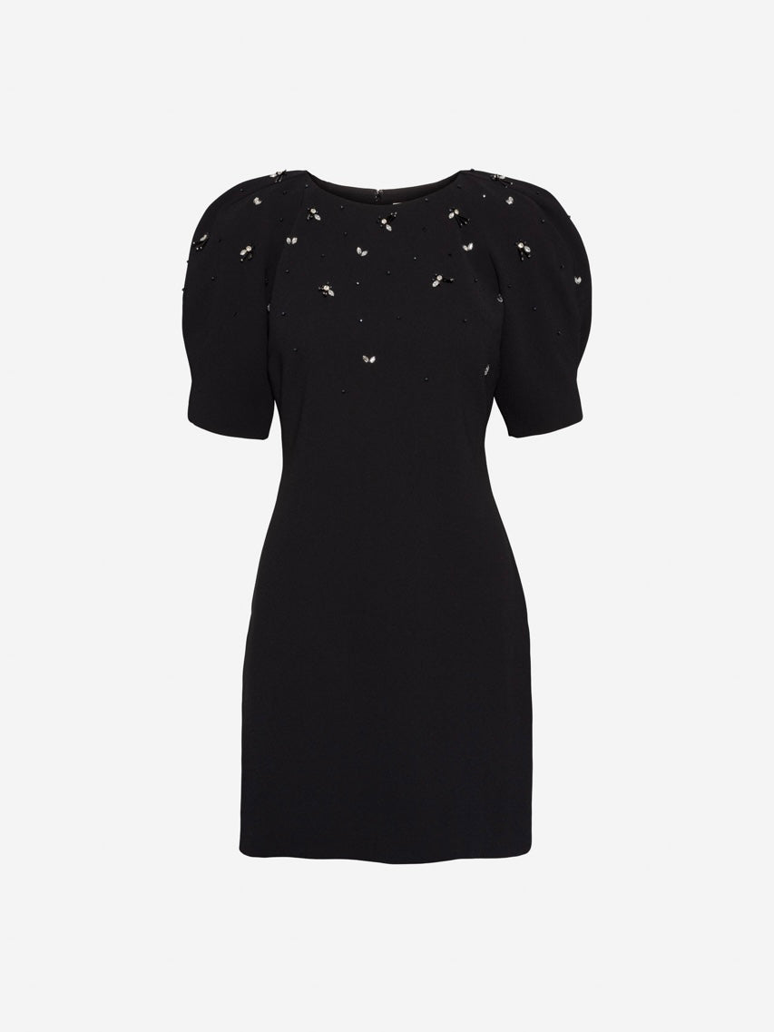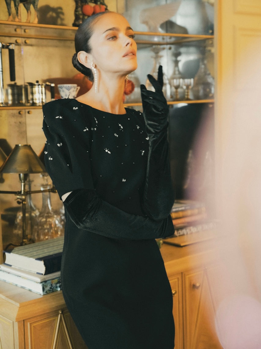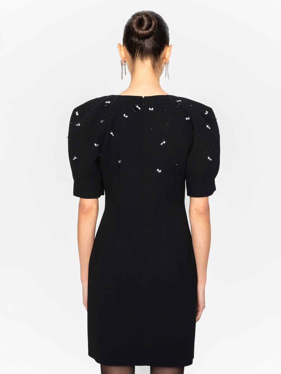 Tava Dress fra Camilla Pihl er en elegant og sofistikert kjole med kroppsnær passform som fremhever silhuetten på en flatterende måte. Kjolen har korte puff-ermer med dekorative steindetaljer som tilfører et eksklusivt preg, samt skulderputer som gir en markert og moderne fasong. Den lukkes med glidelås i ryggen og er laget av resirkulert polyester med helfôret innside for ekstra komfort og holdbarhet. Tava Dress er det perfekte valget til sesongens festlige anledninger.