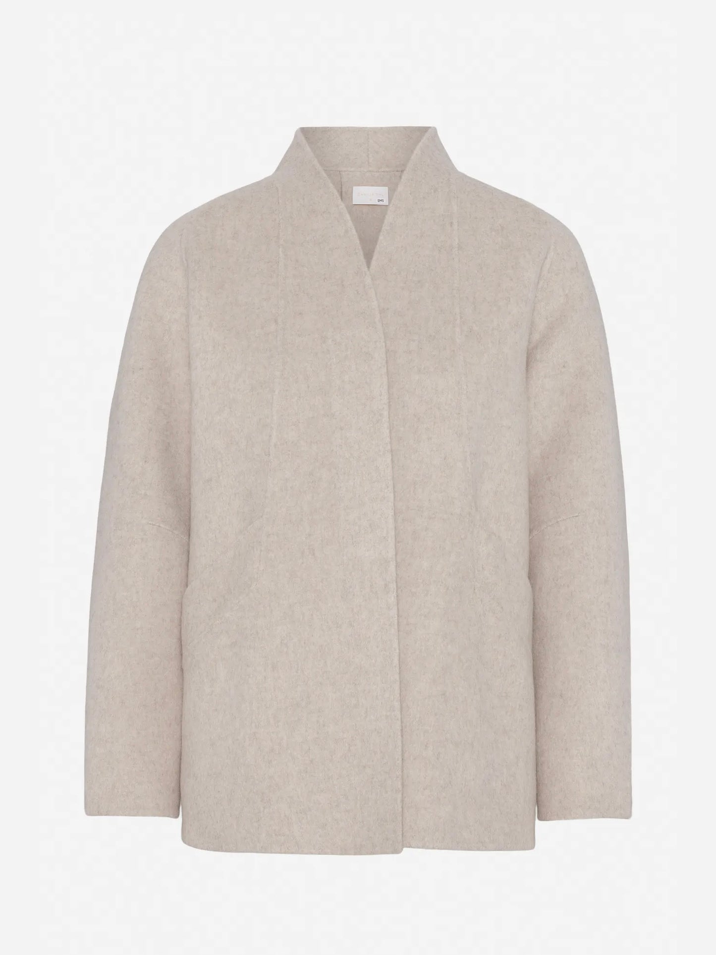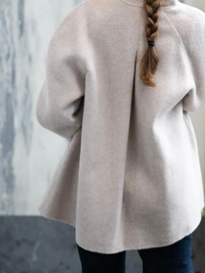 Lekker ulljakke i en delikat lys beige farge. Jakken har liten krage og stikklommer i sidene. Skjulte knapper når du lukker jakken.