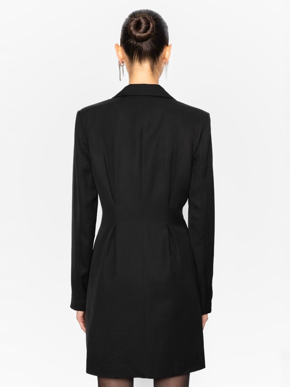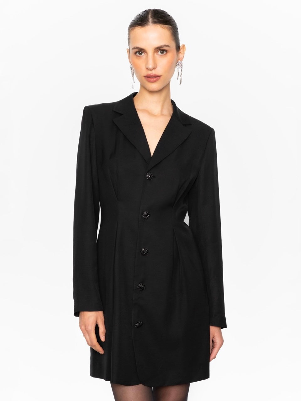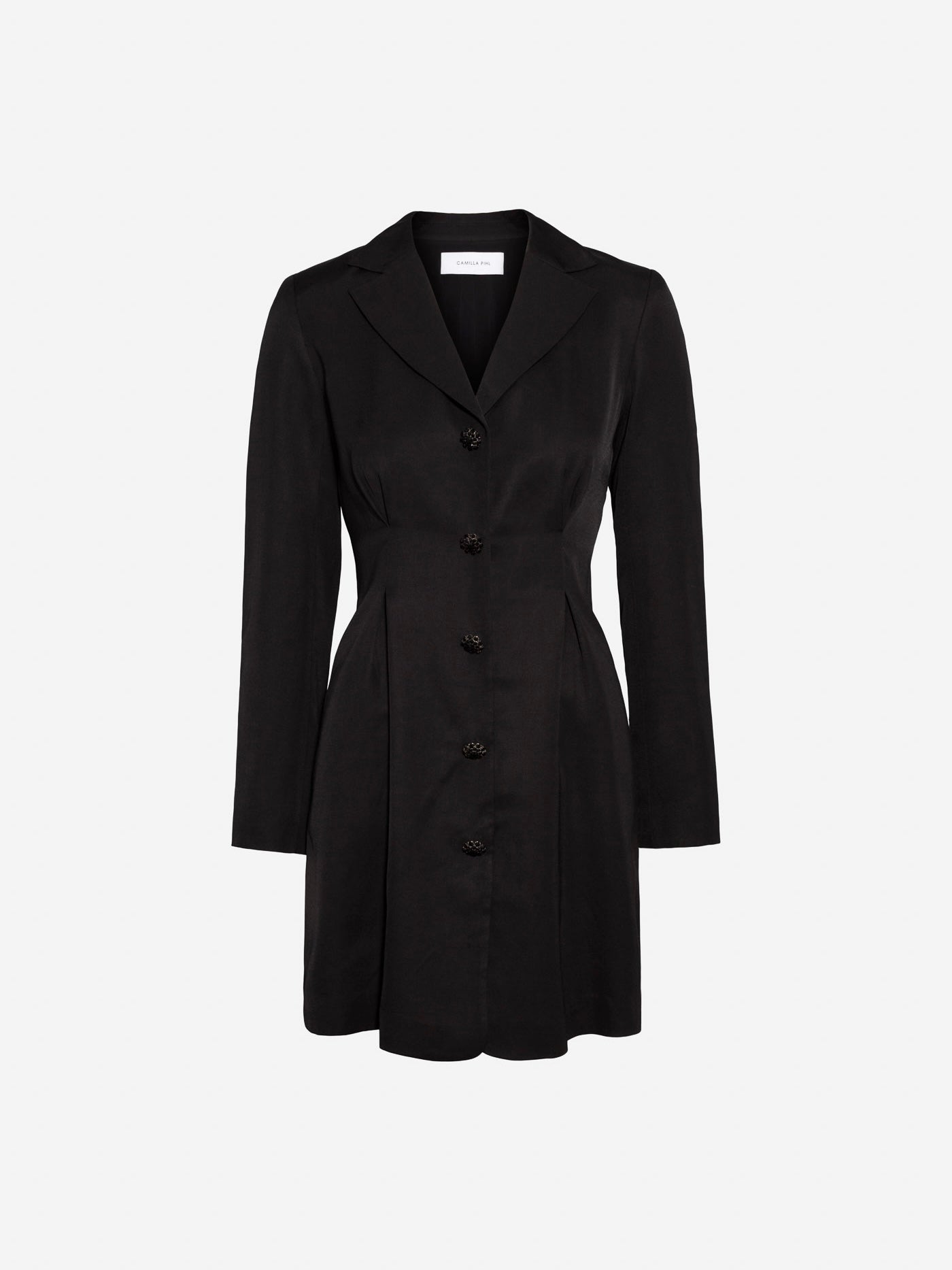 Sophia Jewel Dress fra Camilla Pihl. Elegant og moderne kjole med blazer-inspirert design, komplett med krage og slag. Kjolen lukkes med dekorative diamantknapper i front, og har legg i livet som gir en semi-ettersittende passform. De lange ermene med skulderputer tilfører struktur og et stilsikkert uttrykk.