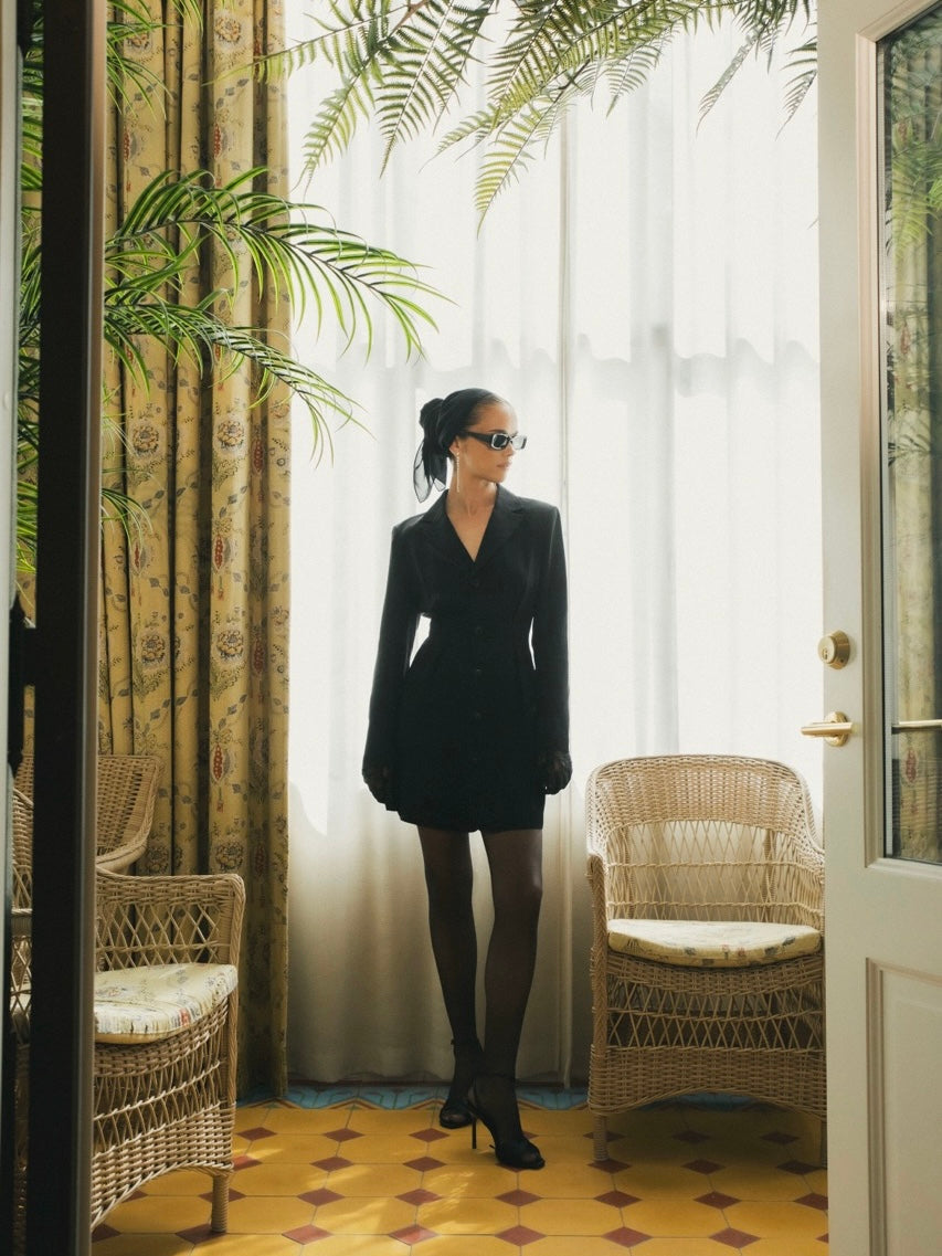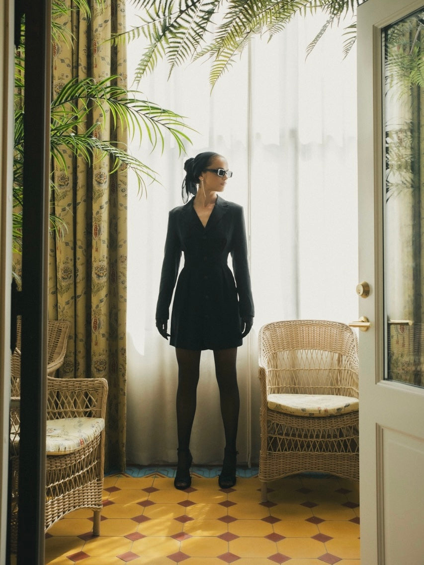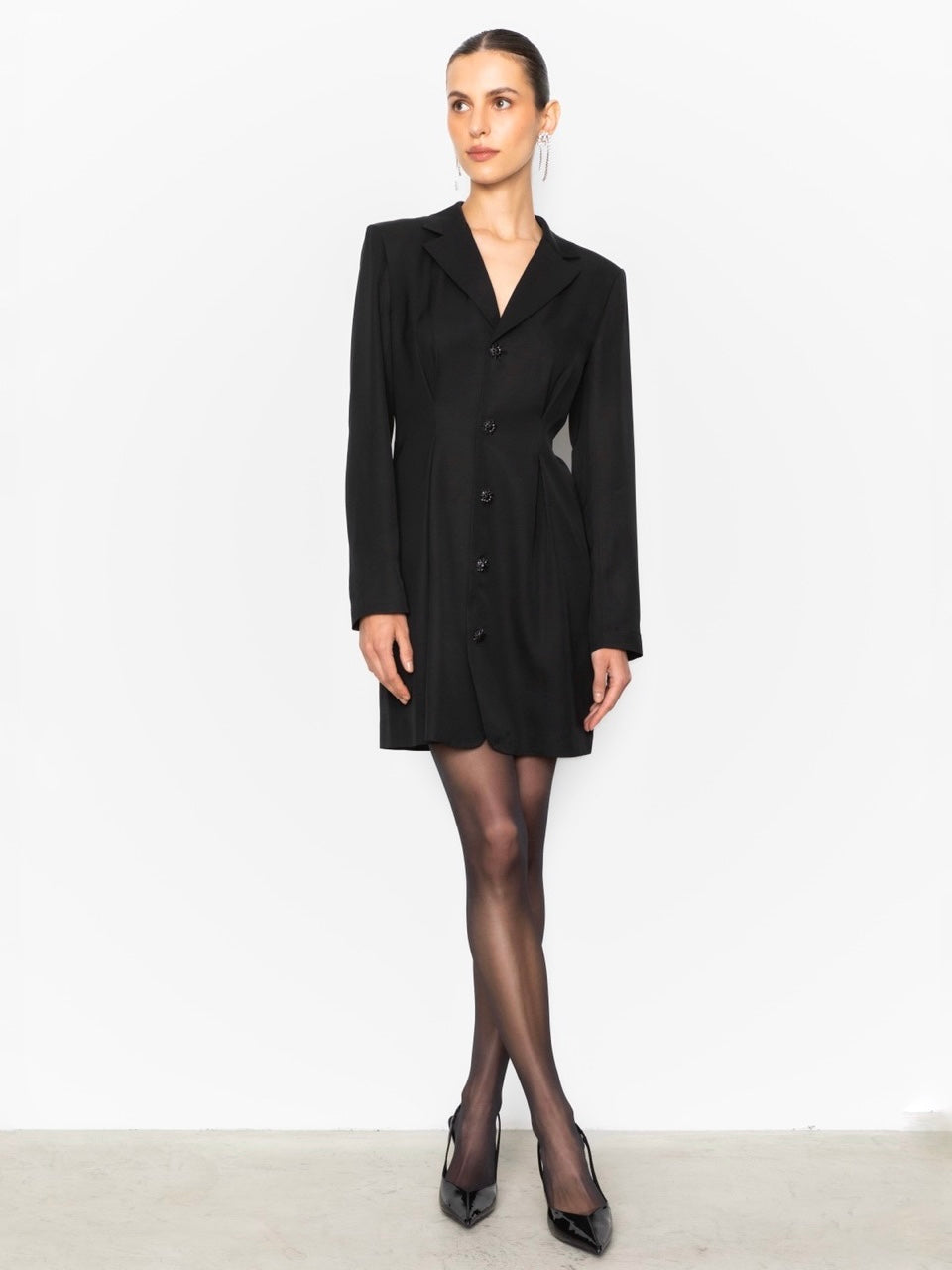 Sophia Jewel Dress fra Camilla Pihl. Elegant og moderne kjole med blazer-inspirert design, komplett med krage og slag. Kjolen lukkes med dekorative diamantknapper i front, og har legg i livet som gir en semi-ettersittende passform. De lange ermene med skulderputer tilfører struktur og et stilsikkert uttrykk.