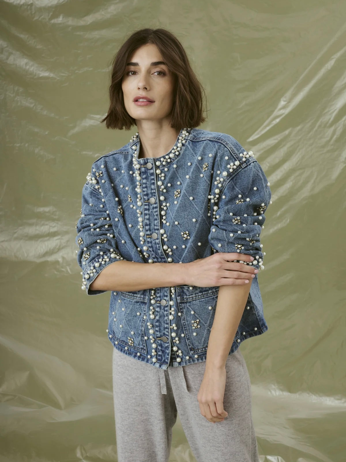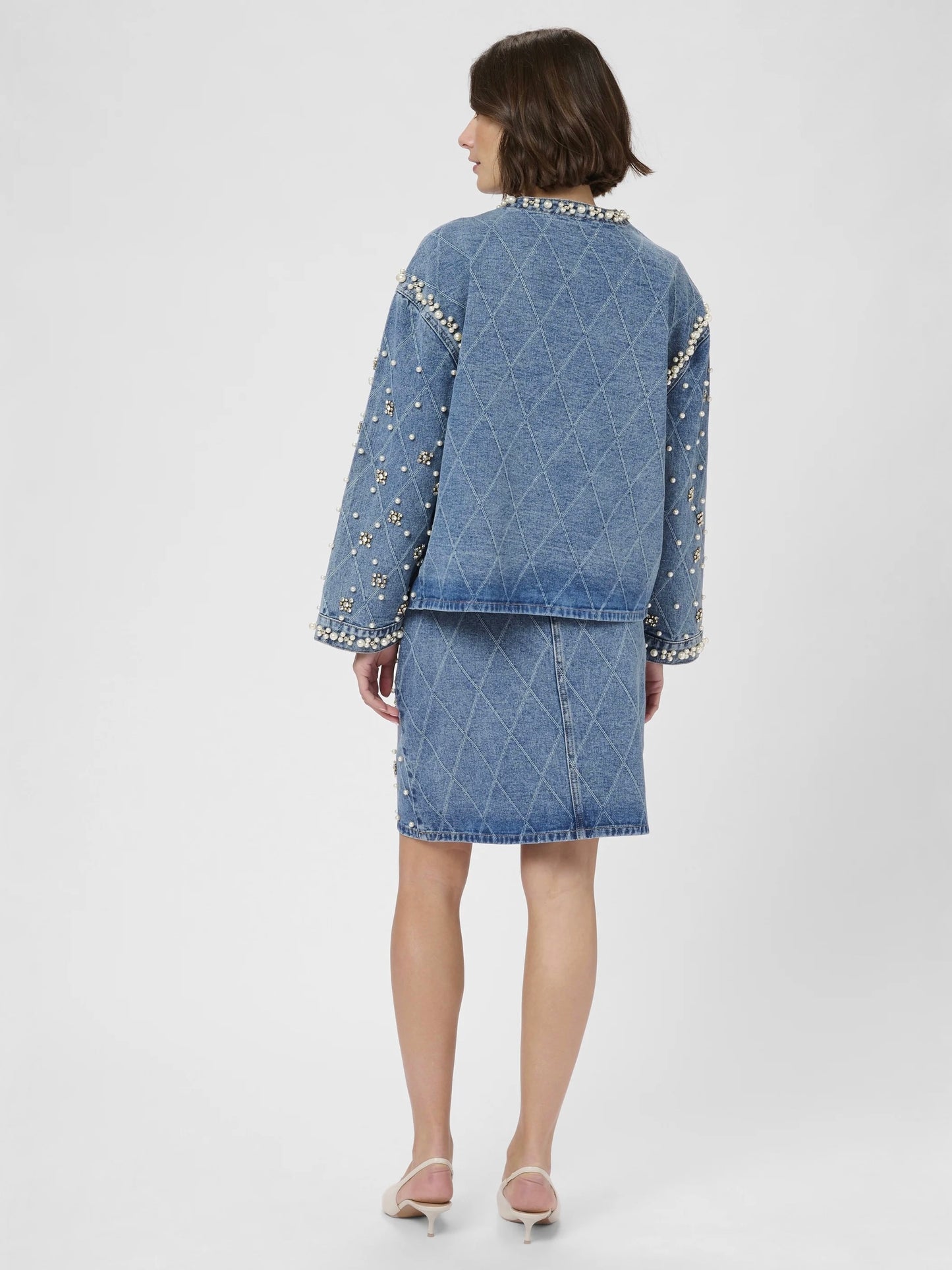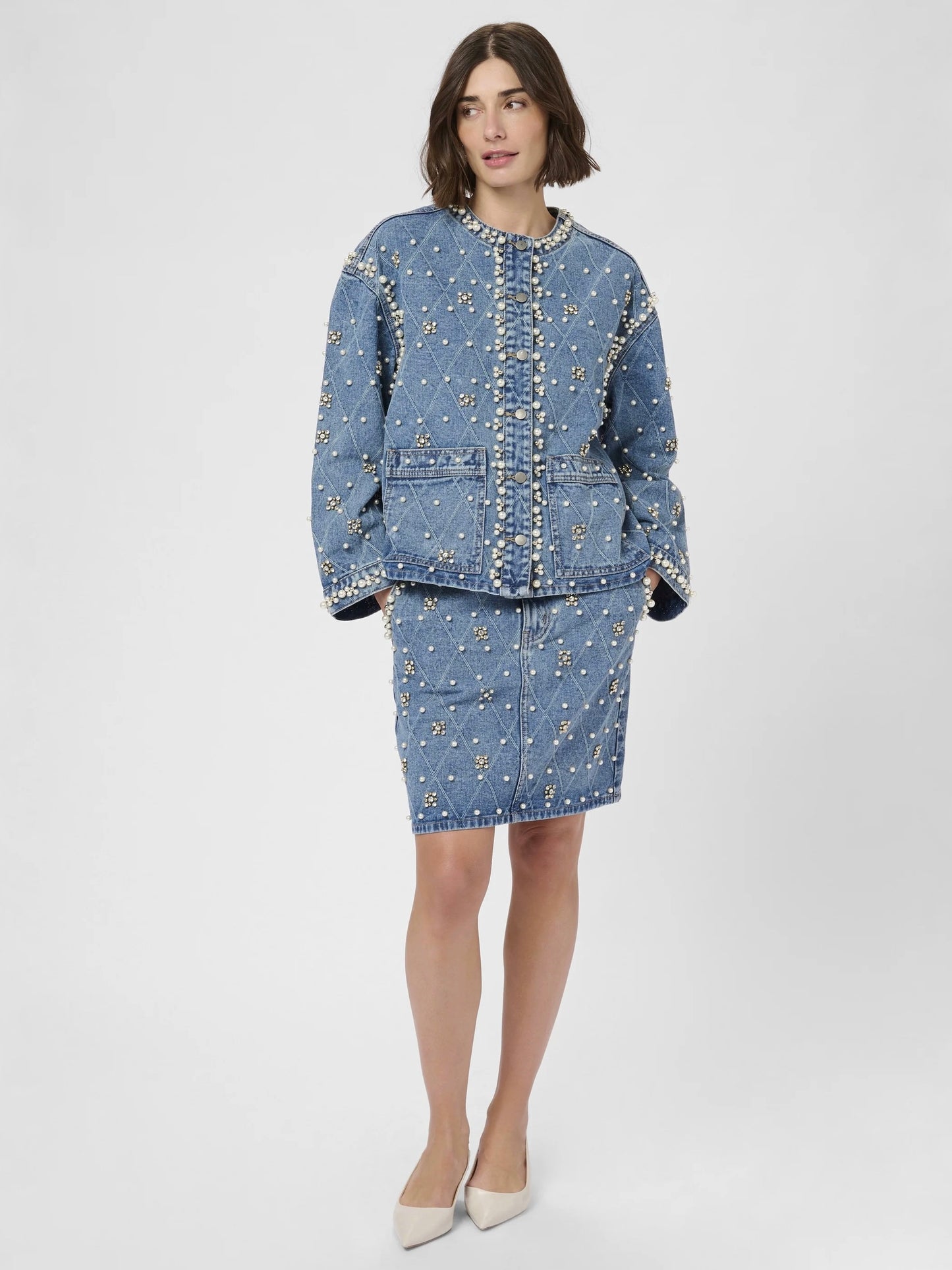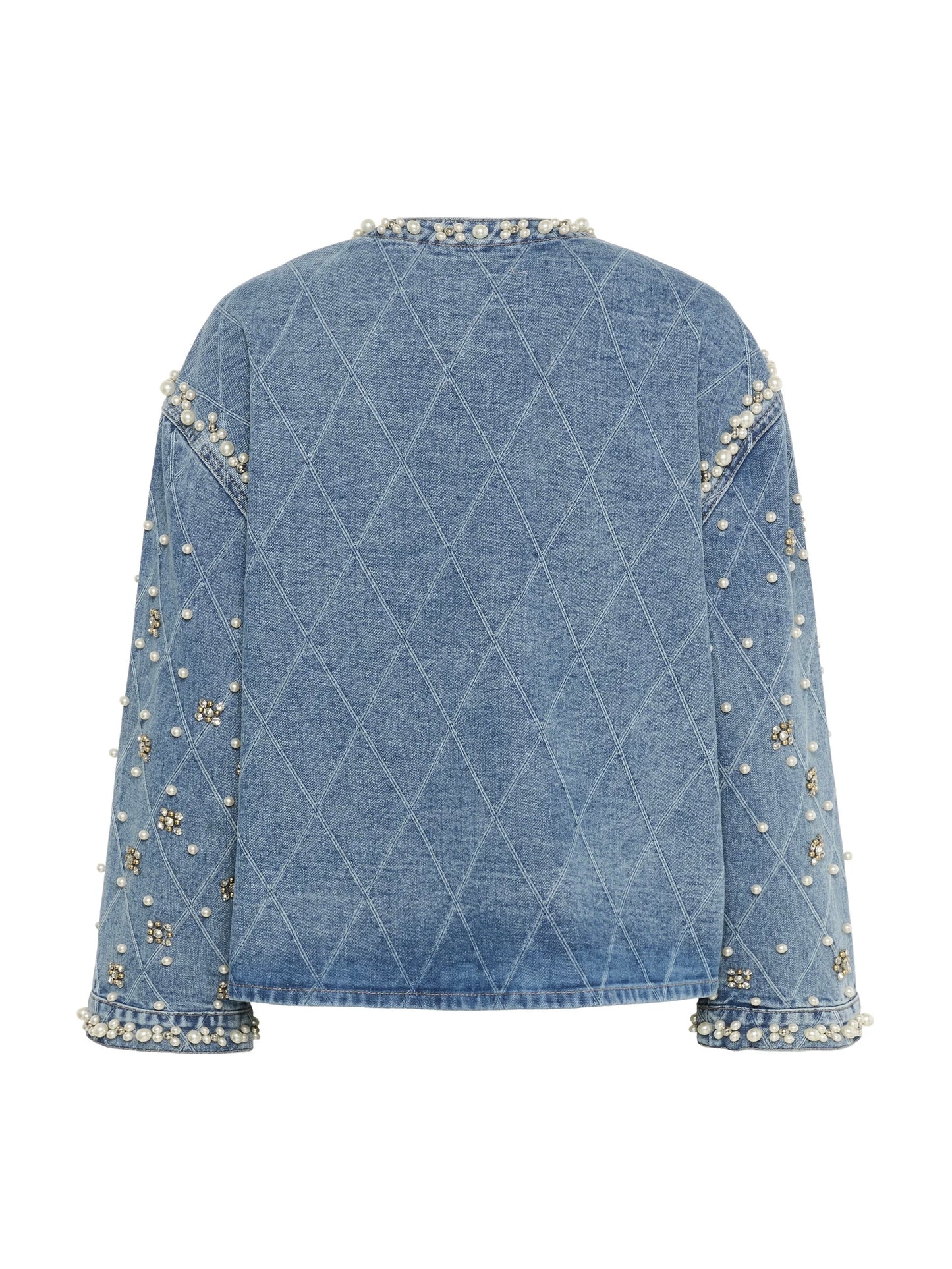 Alys Denim Jacket fra Culture. Løs og rett modell i lys blå denim med rund hals og lange ermer. Jakken er en ekte blikkfang med dekorative strass-steiner og perler som gir et feminint og unikt uttrykk.