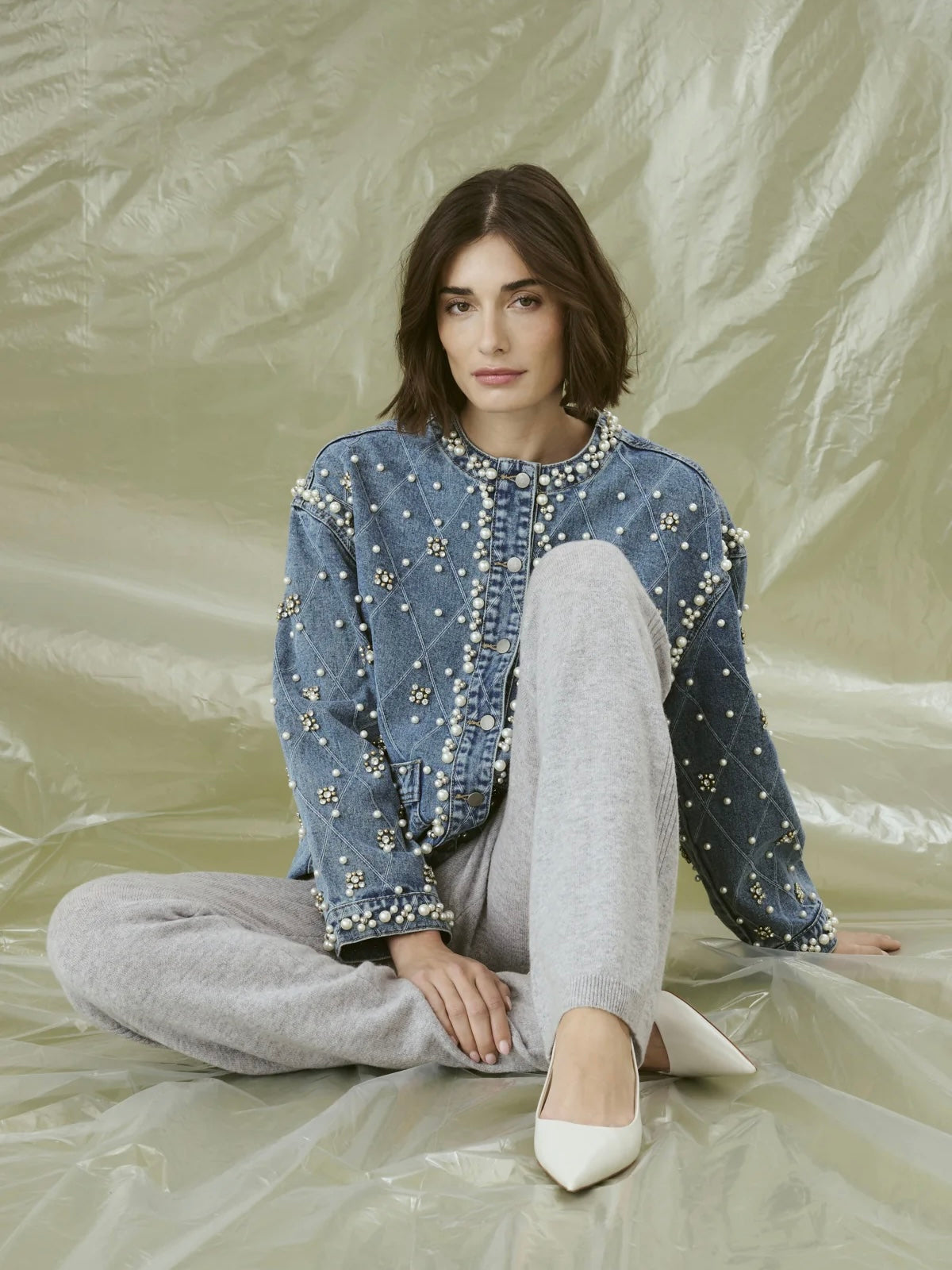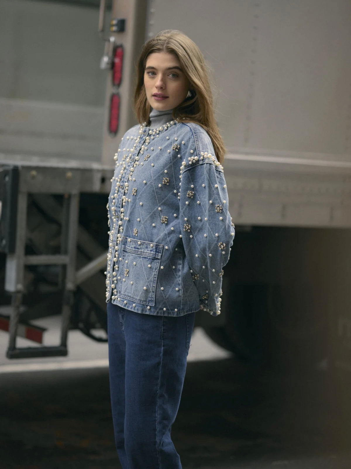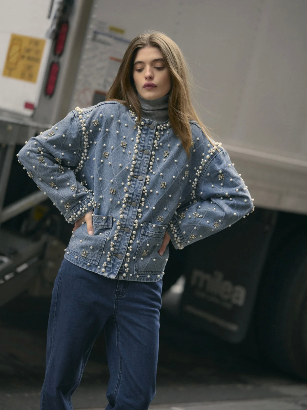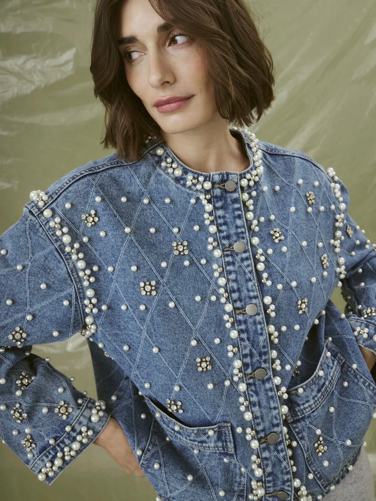 Alys Denim Jacket fra Culture. Løs og rett modell i lys blå denim med rund hals og lange ermer. Jakken er en ekte blikkfang med dekorative strass-steiner og perler som gir et feminint og unikt uttrykk.