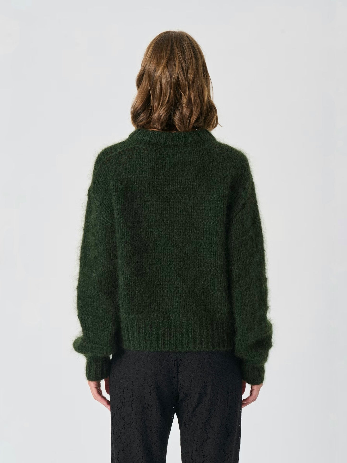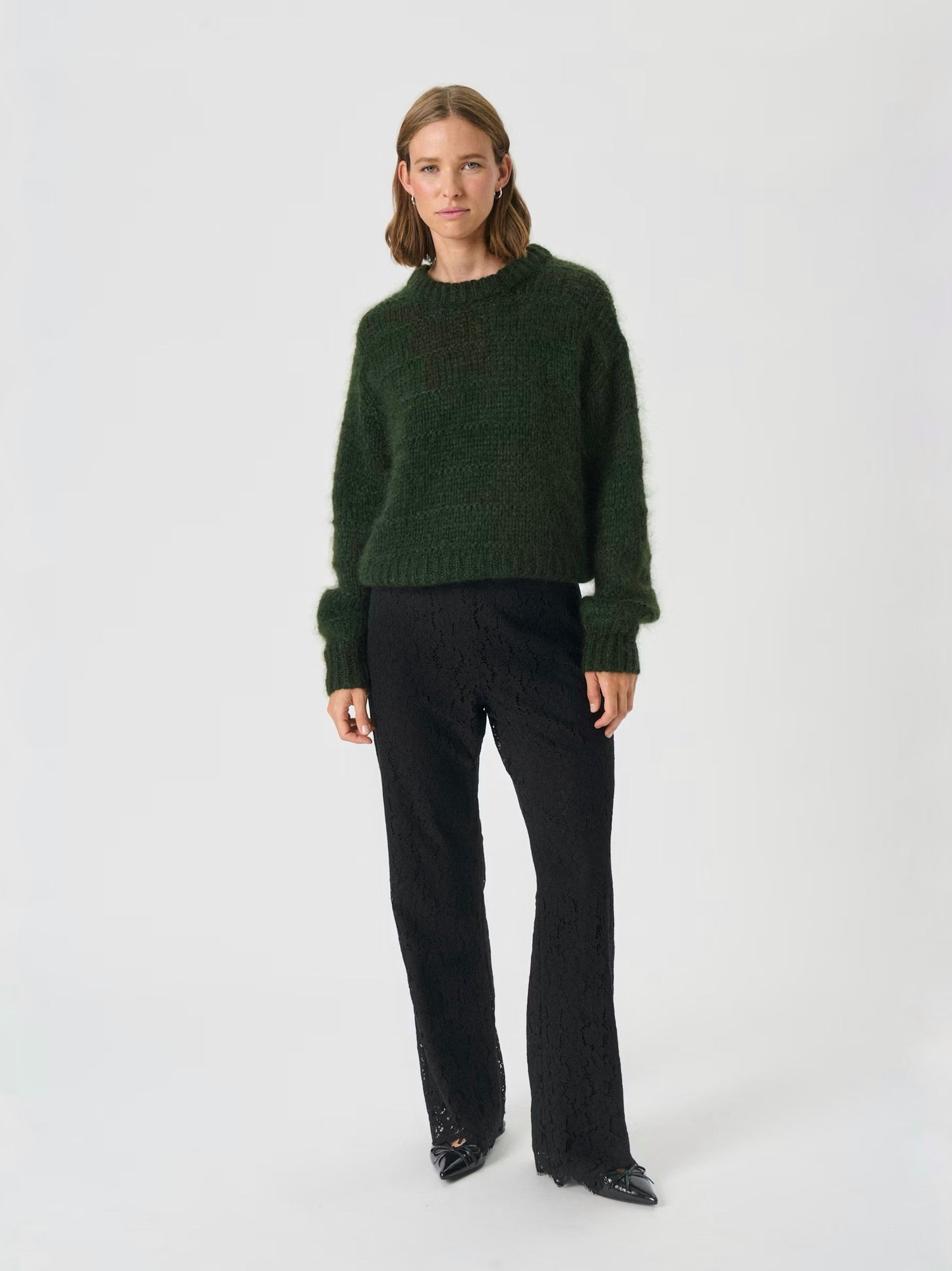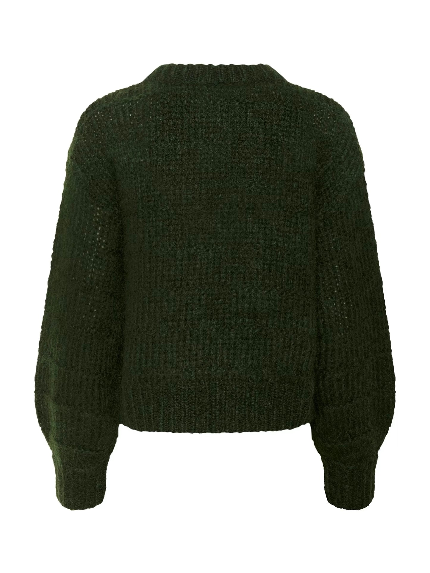 Vilma PU Knit fra Part Two. En myk og fluffy strikkegenser i dyp, skoggrønn farge. Genseren har en avslappet passform med rund hals og brede ribbestrikkede kanter som gir et lunt og tidløst uttrykk. Like fin til jeans som over et skjørt – perfekt for både hverdager og rolige dager hjemme. Modellen er 178 cm høy og bruker størrelse M.