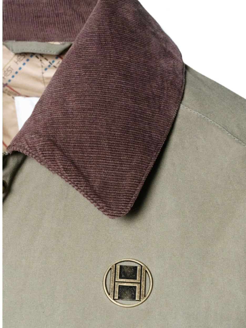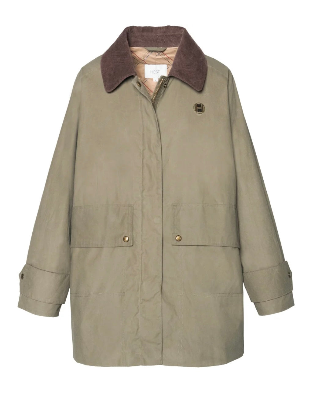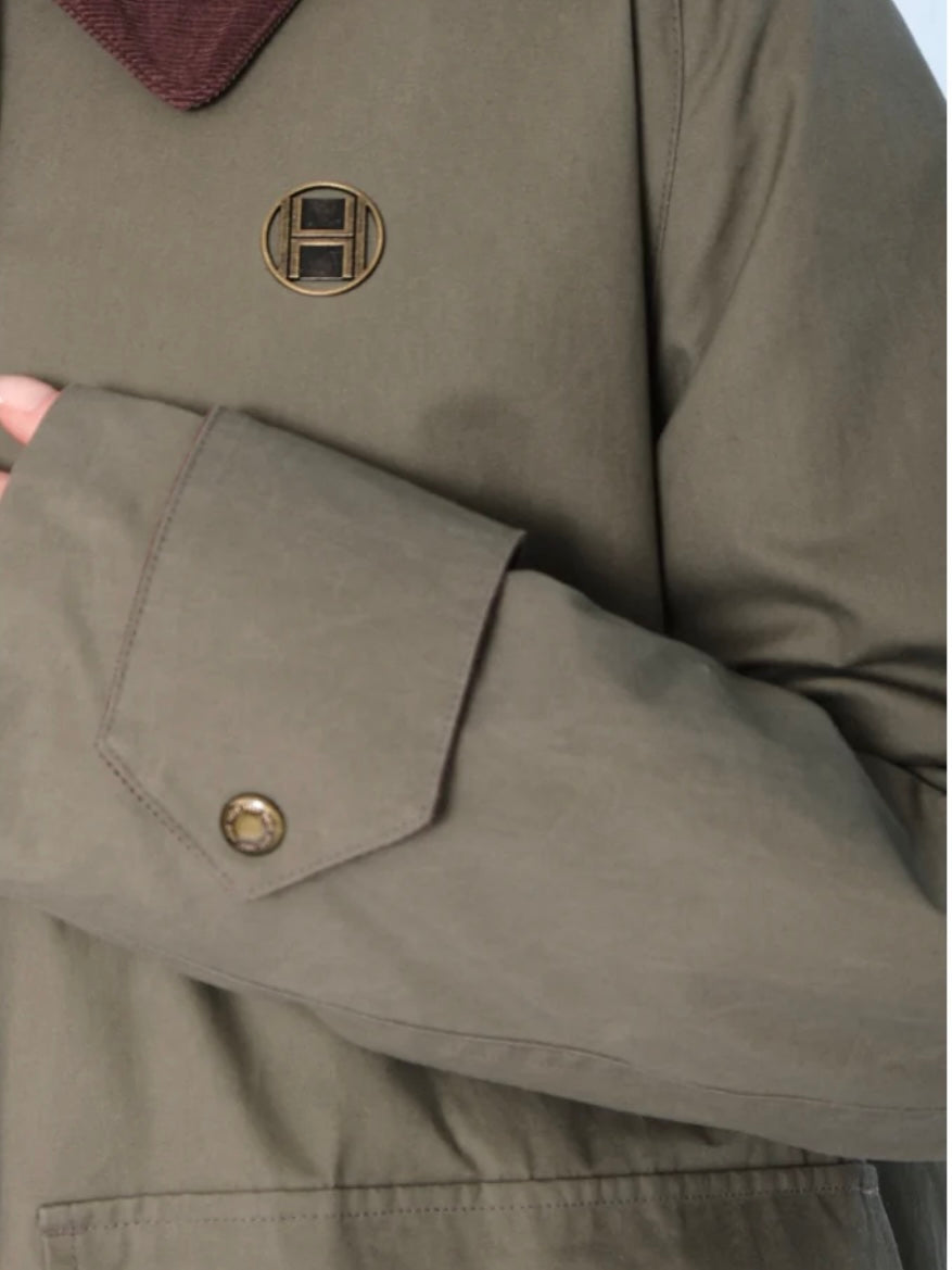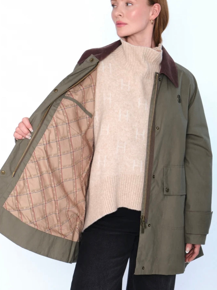 Denne stilige ytterjakken i grønn farge kombinerer funksjonalitet med et moderne design. Den har en brun kontrastfarge på kragen som gir et sofistikert preg. Jakken har justerbare mansjetter, lommer foran, god lengde og synlig H-logo foran. Lukkes med glidelås foran.