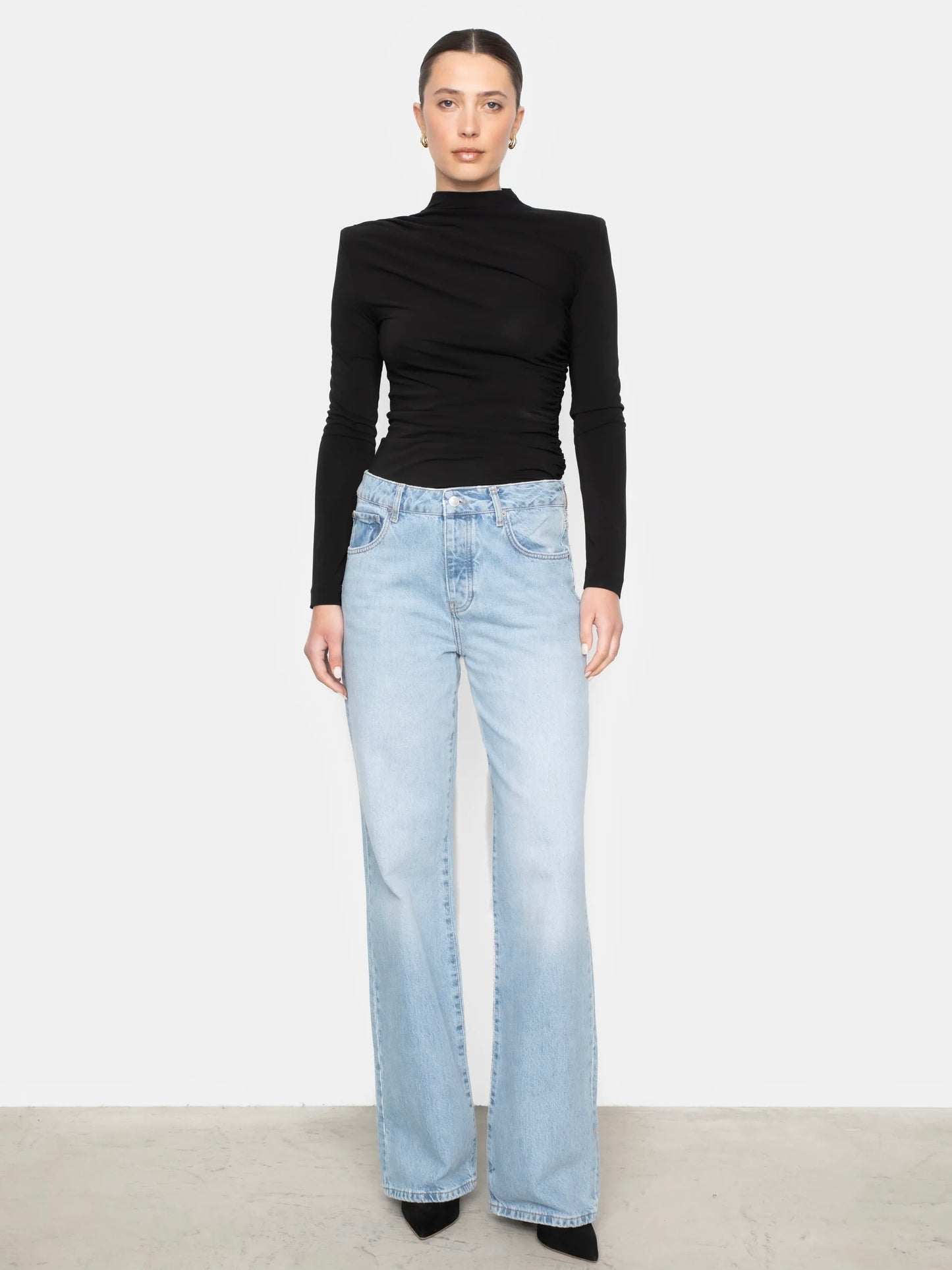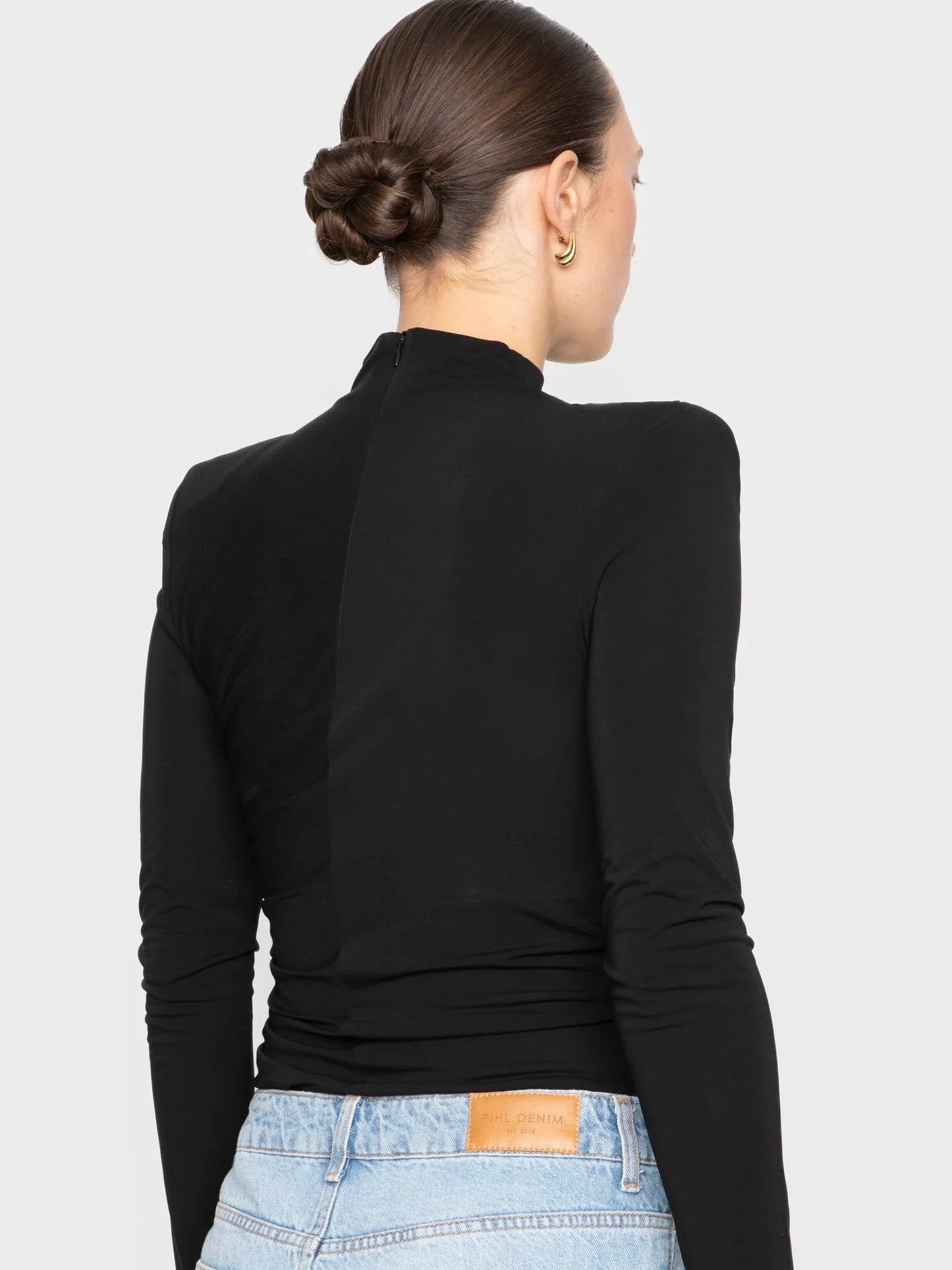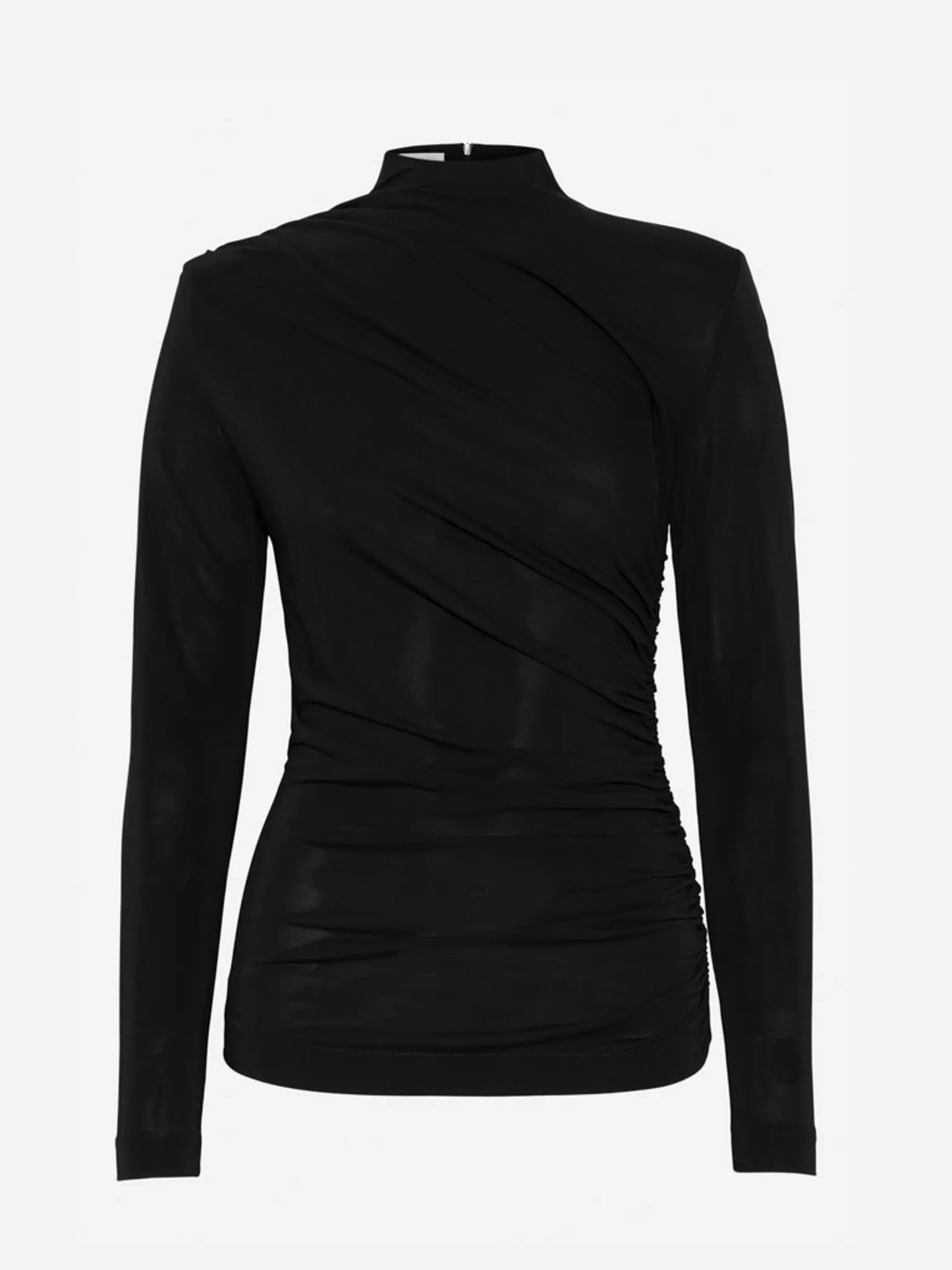 En moderne, tettsittende topp med ståkrage, polstrede skuldre og draperte detaljer i midjen. Den skjulte glidelåslukkingen fullfører det elegante og strukturerte designet.