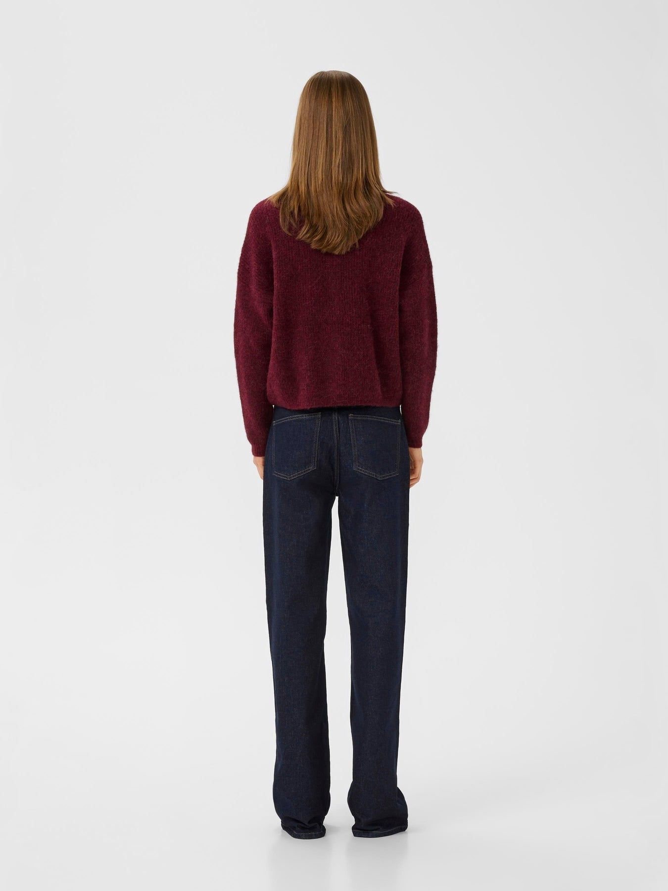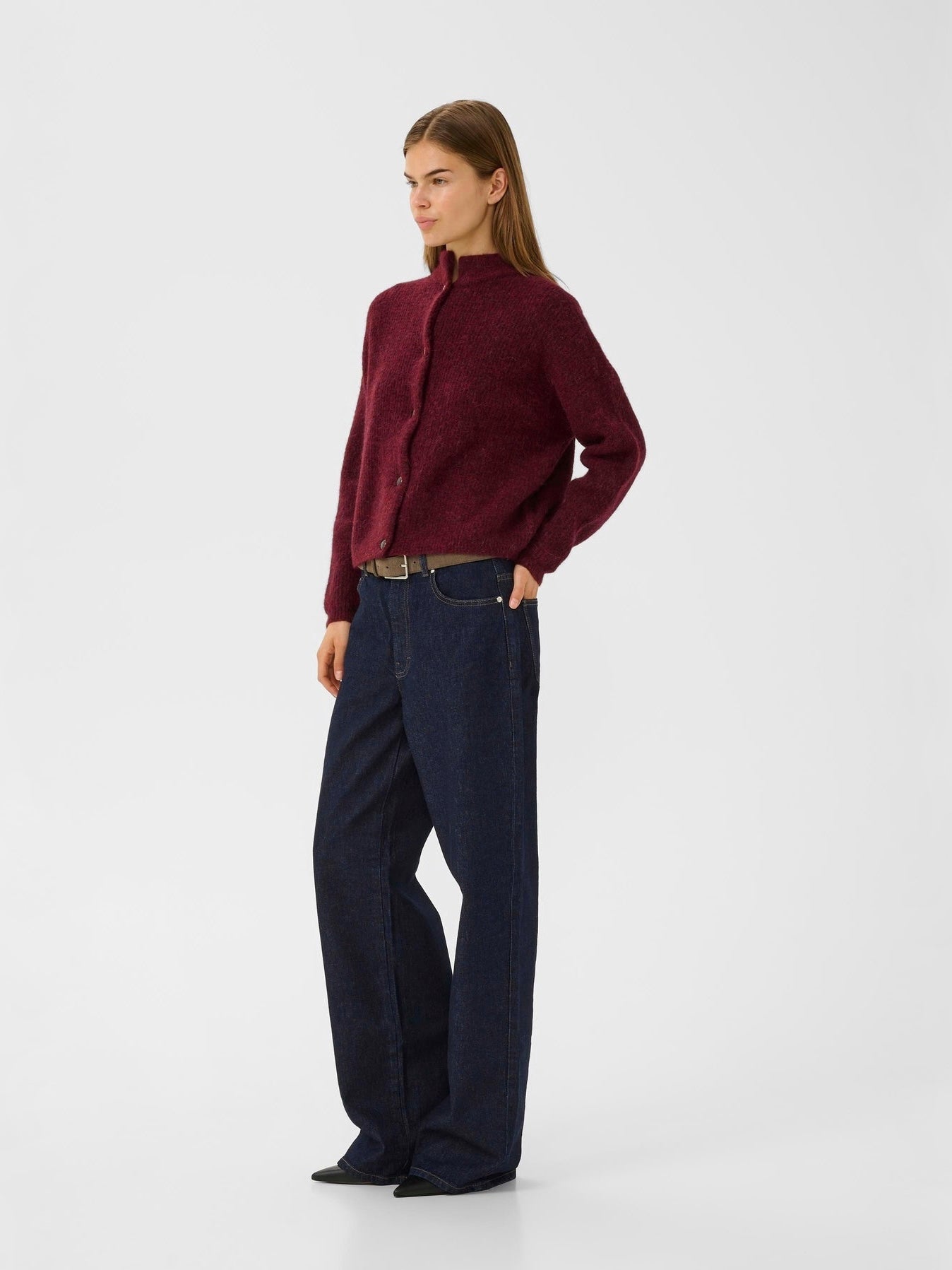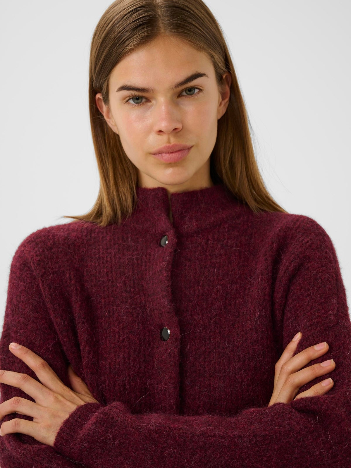 Alpha GZ Short Cardigan Blood Red Melange fra Gestuz er en deilig cardigan i en delikat burgunderfarge og i børstet kvalitet. Myk alpakkablanding. Cardiganen har semihøy hals og sorte, blanke, dekorative knapper foran. Boxy fasong. Noe stor i størrelsen. Vipper du mellom to størrelser, anbefaler vi å gå for den minste.