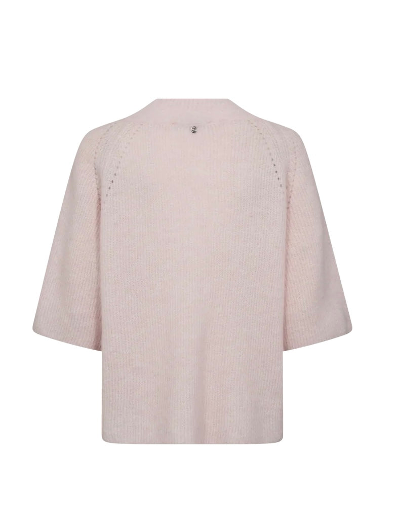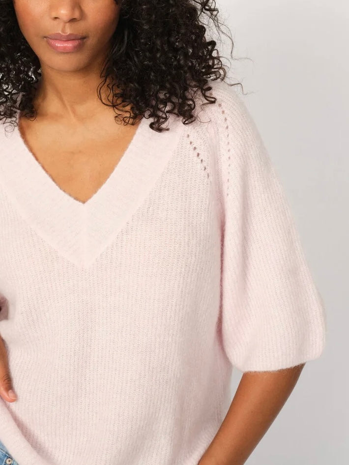 En herlig myk, strikket genser fra Mos Mosh i en lekker rosa farge. Den er vid i fasongen, ribbet V-hals og 3/4 lengde på ermene. Genseren har også noen åpne strikkede detaljer på skuldrene og splitt på hver side i bunnen som gir det lille ekstra.
