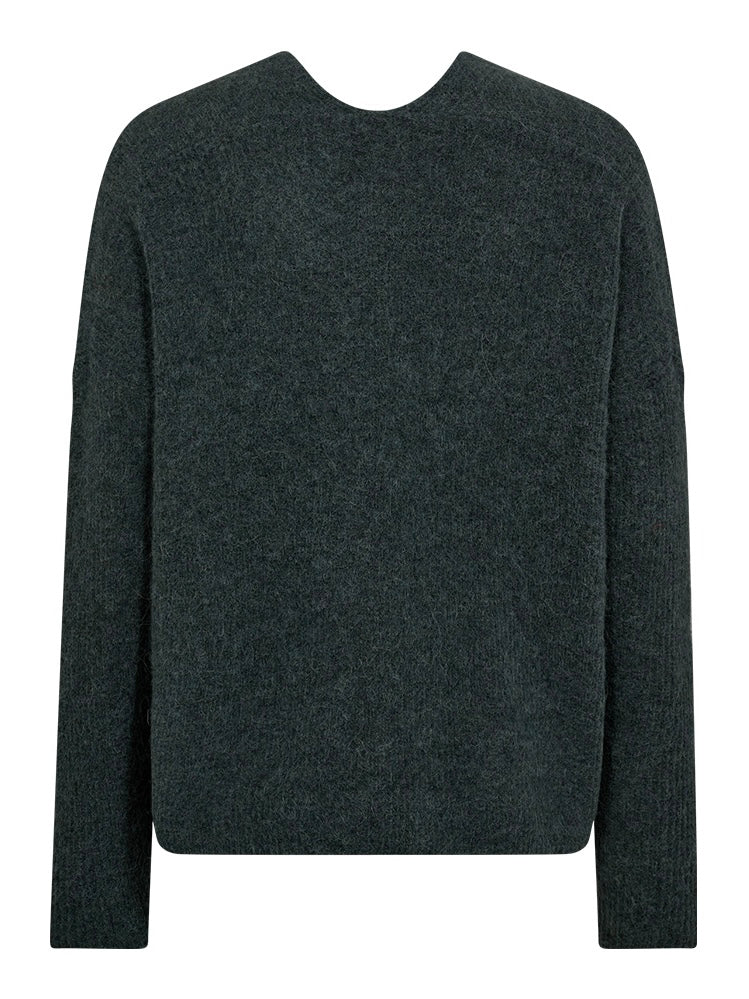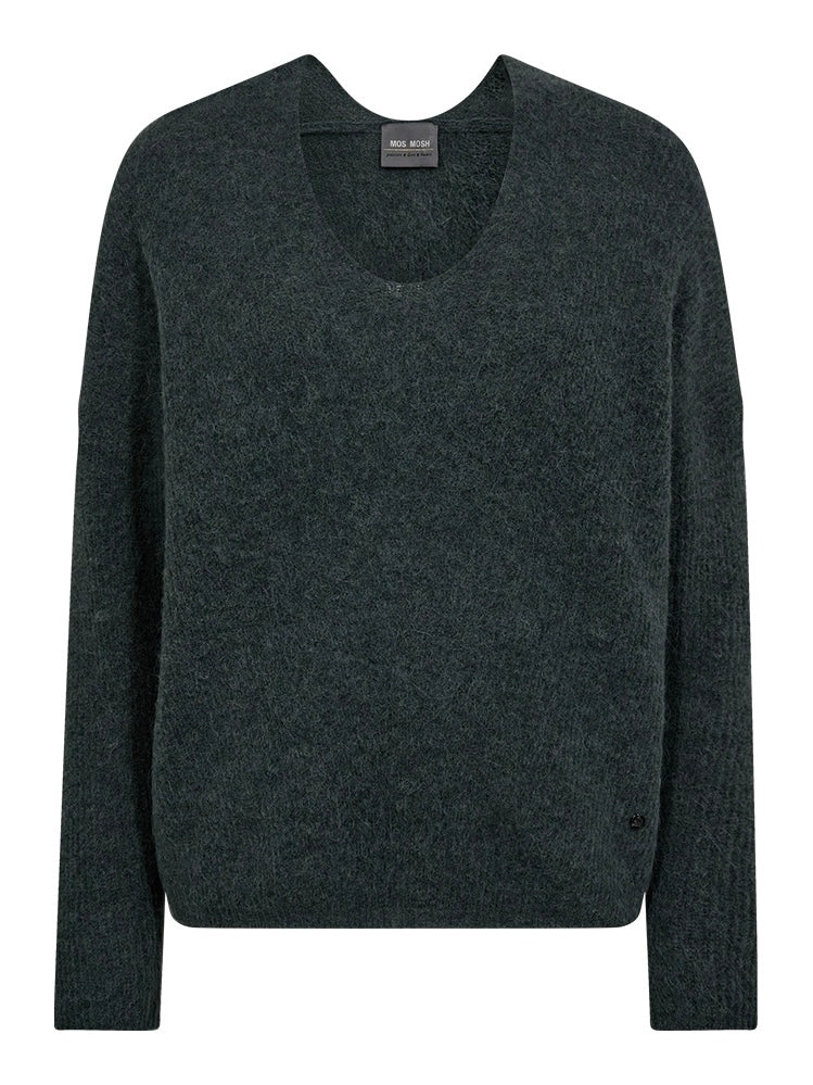 Tidløs, avslappet herlig strikkegenser fra Mos Mosh i en flott grønntone. Thora er strikket av superlett alpakka og ullblanding og designet med en dyp flatterende V-hals og falle skuldre.