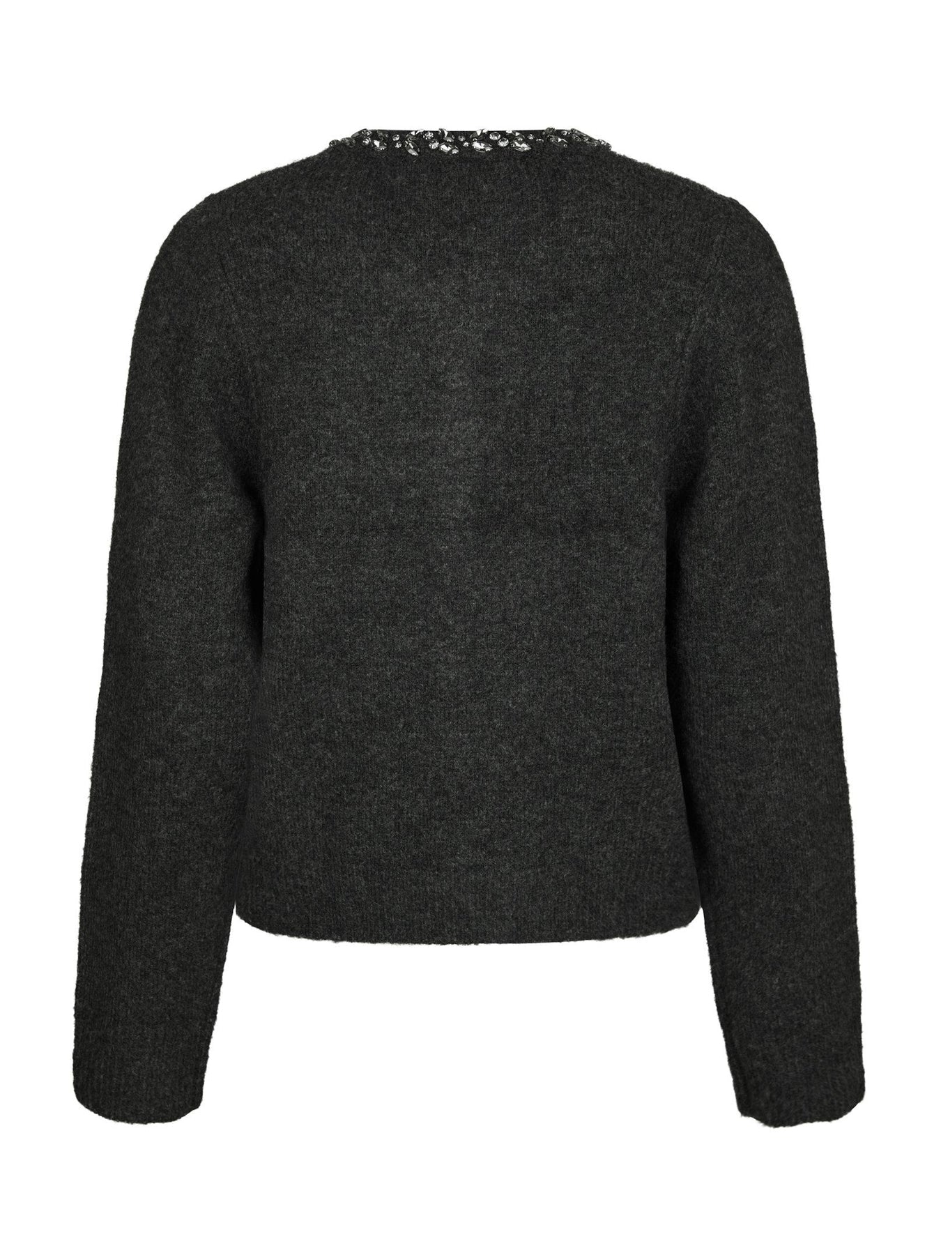 Marie Stone Knit Cardigan fra Neo Noir. En utrolig elegant, strikket cardigan i en dyp antrasittgrå farge. Cardiganen har en klassisk, rund hals som er vakkert pyntet med mørke, fasetterte stener, noe som gir et luksuriøst og sofistikert uttrykk.