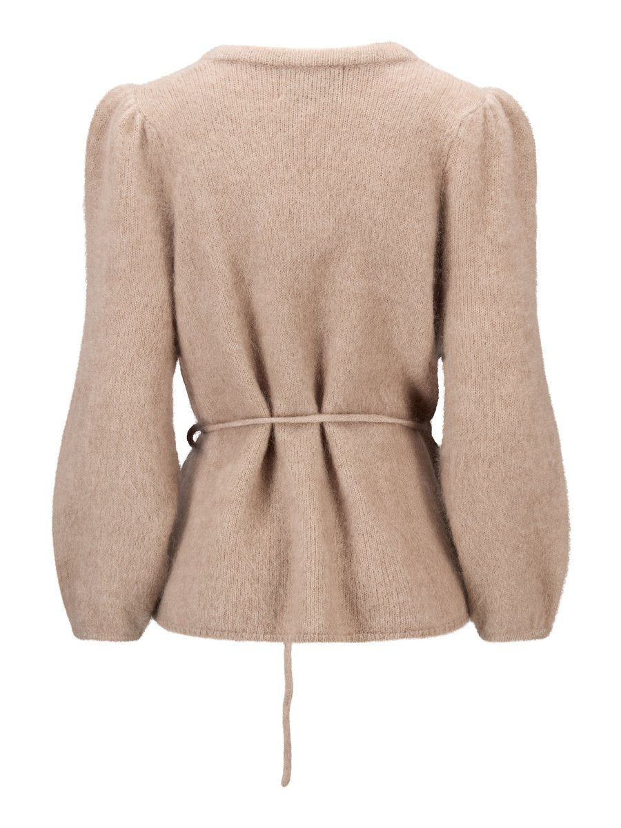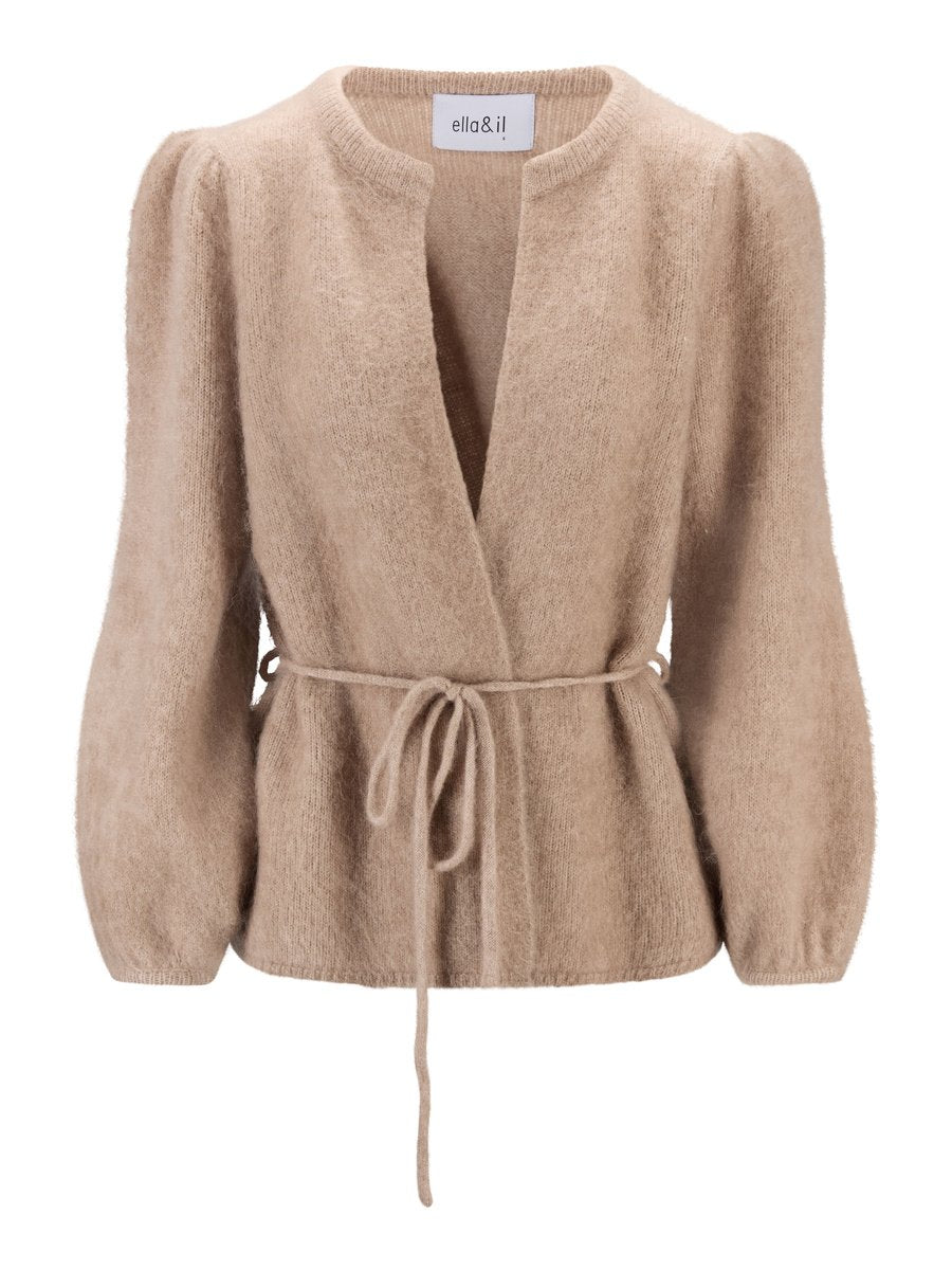 Fredrikke Chunky Cardigan Hazel Beige fra Ella & Il. En beige drømmecardigan som er feminin, varm og superallsidig. Den har lange ballongermer, omslagseffekt med V-utringning og et tynt knytebelte i livet som fremhever fasongen. Like fin til skinnbukser som over en kjole – et perfekt valg til både hverdags og fest.