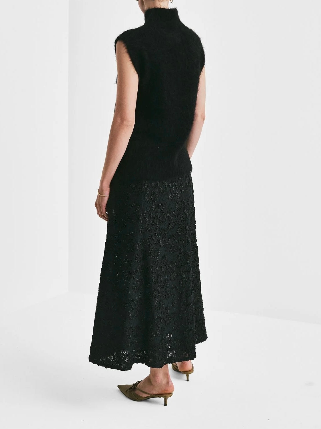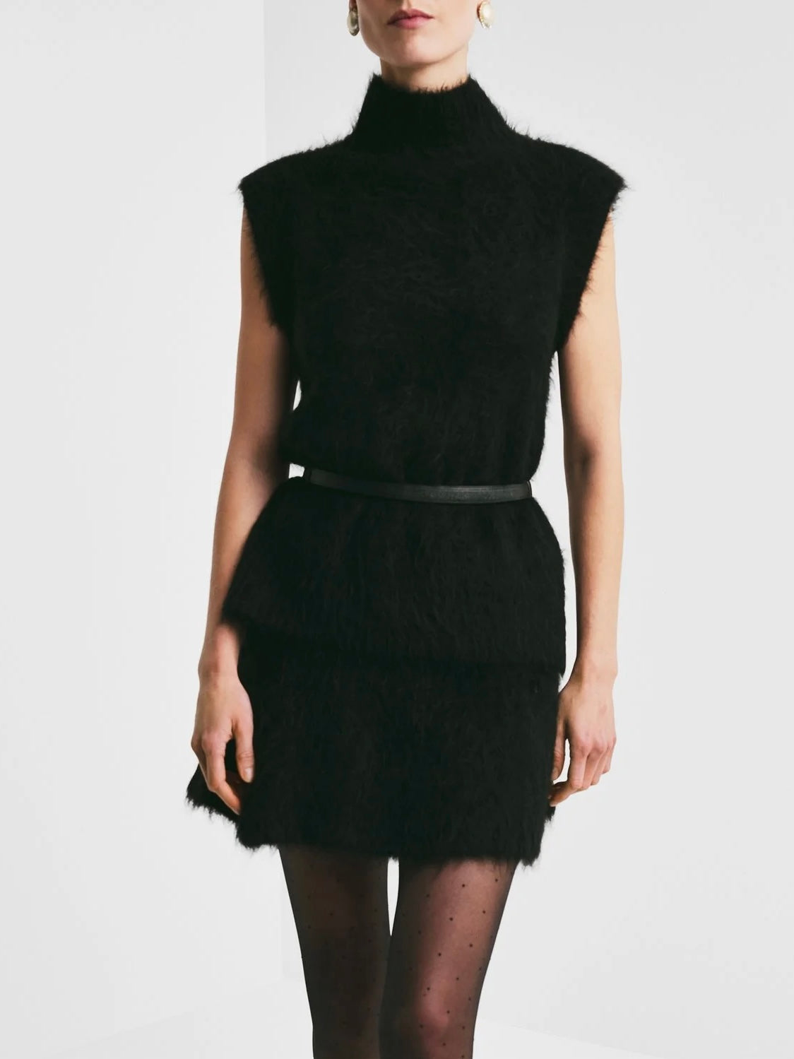 The Hairy Knit Top fra ByTimo er en sort, luksuriøs og myk topp laget i merkets lodne blanding av RAS-sertifisert alpakkagarn. Den har en elegant, rett silhuett med høy hals og er ermeløs – perfekt for lag-på-lag eller alene som et statement-plagg. Ribbestrikkede detaljer i hals og nederkant gir en raffinert finish.