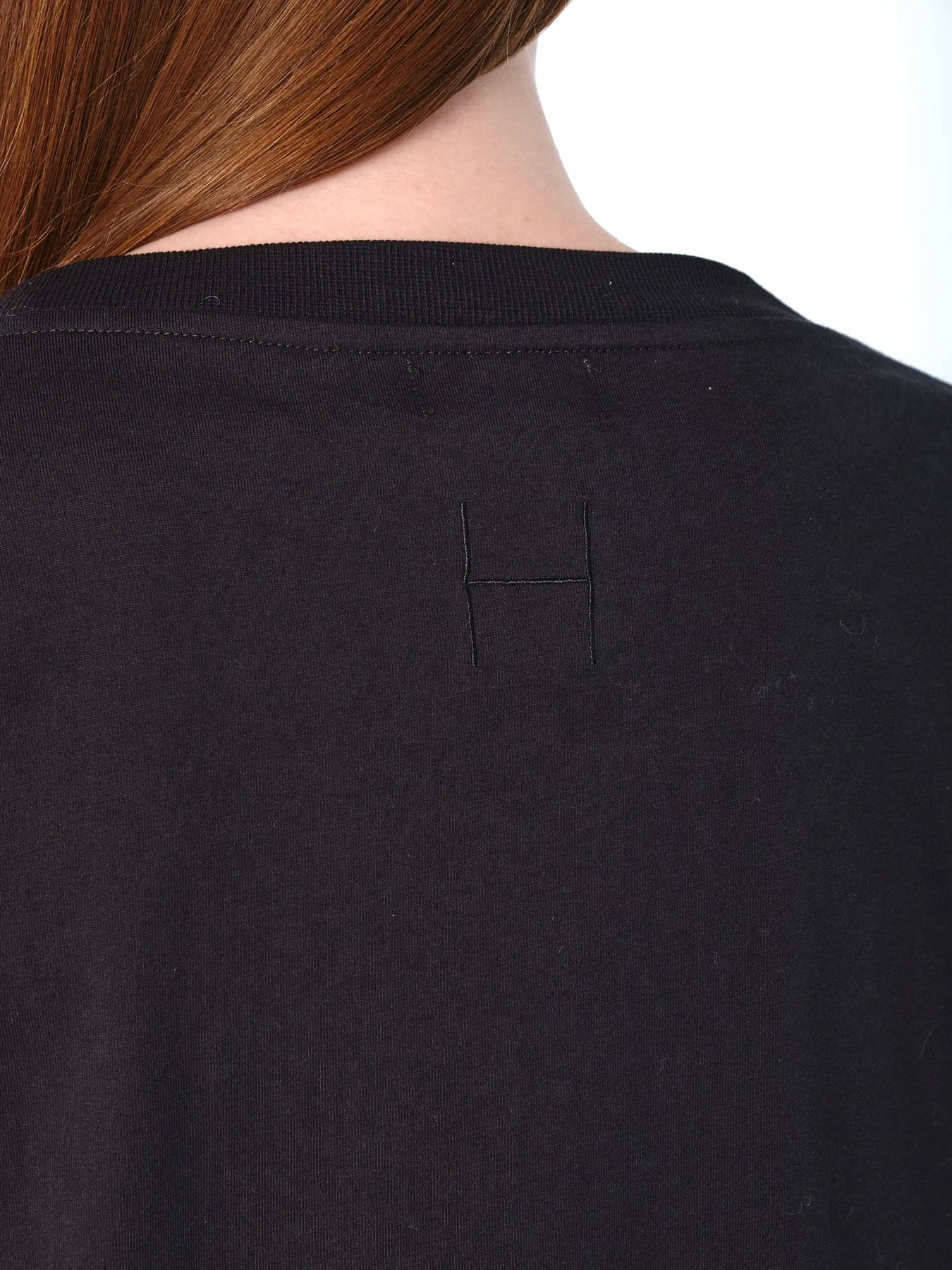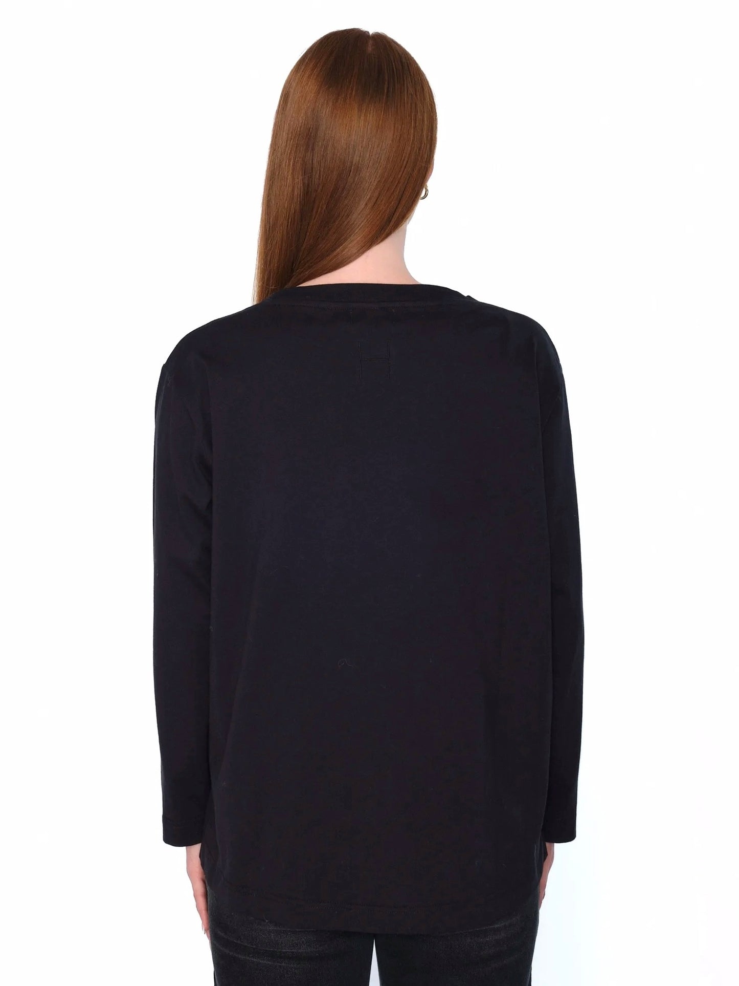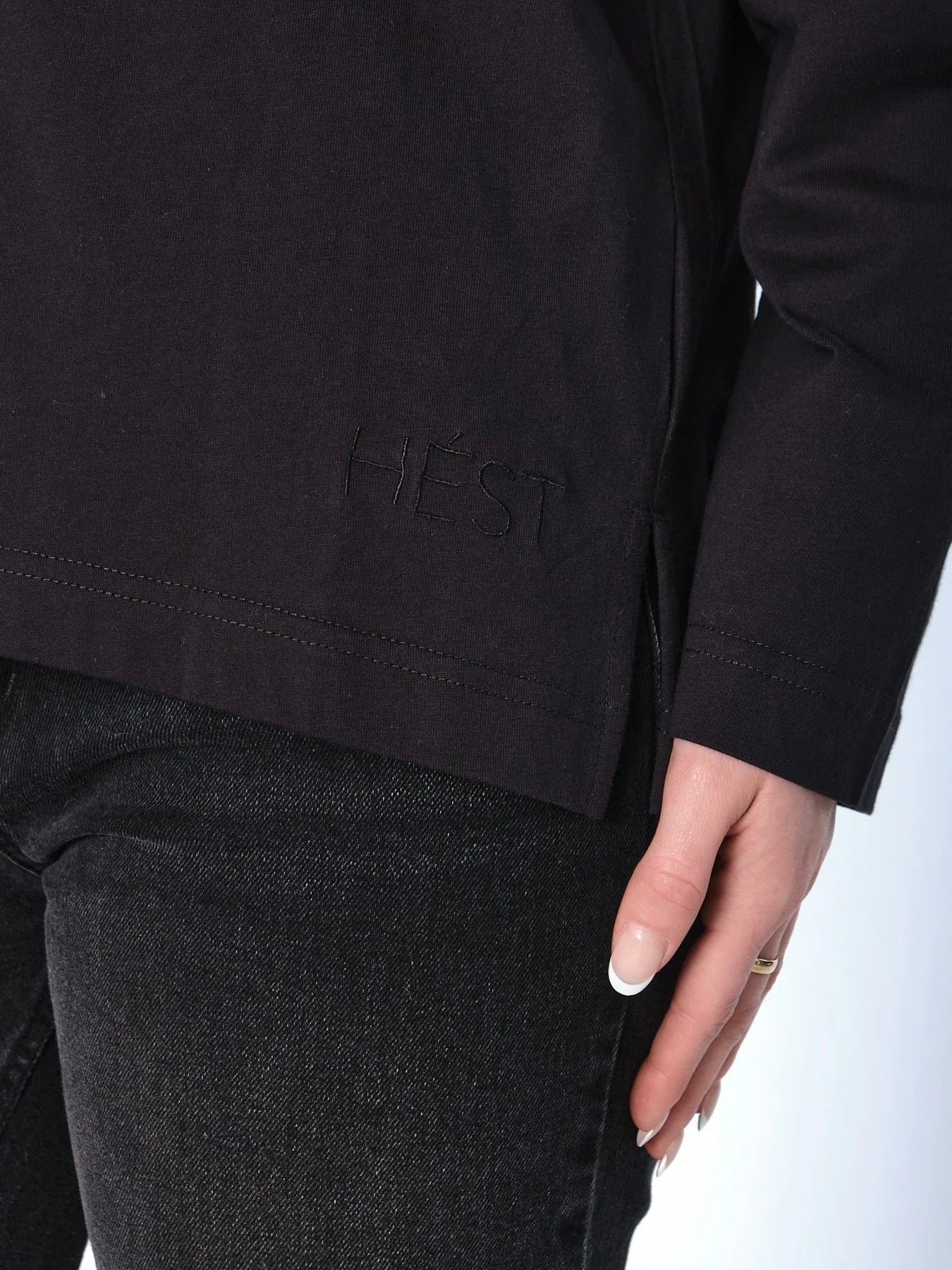 Nellie Longsleeve Jet Black fra Hést. Hev din uformelle garderobe med Nellie langermet t-skjorte, laget av 100% bomullsjersey. Dette allsidige plagget gir en komfortabel passform og et tidløst design, som gjør det perfekt for enhver sesong. Omfavne både stil og komfort med NELLIE Longsleeved T-skjorte, et essensielt plagg i enhver garderobe.