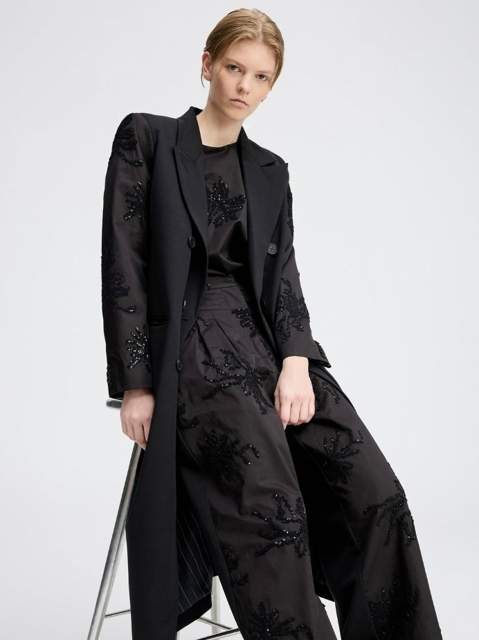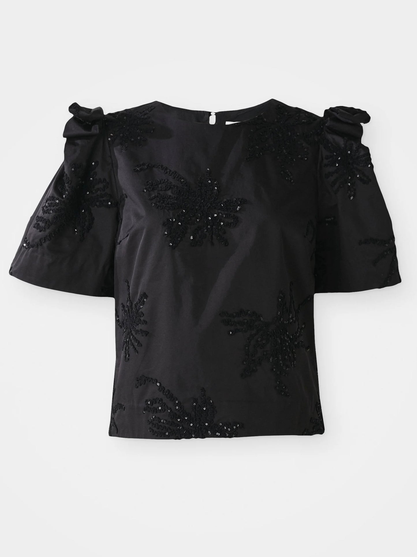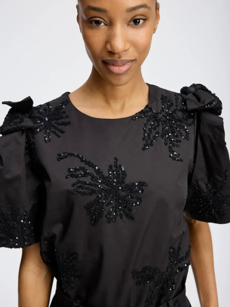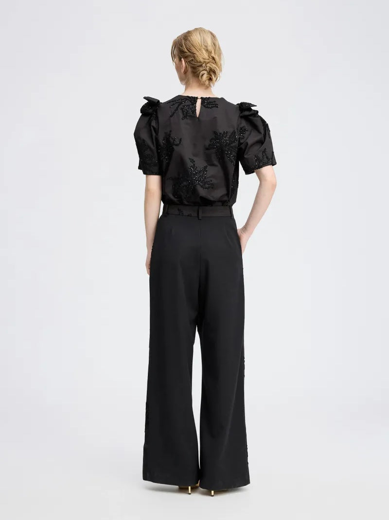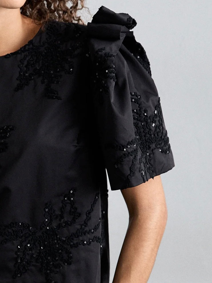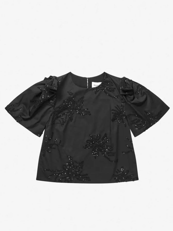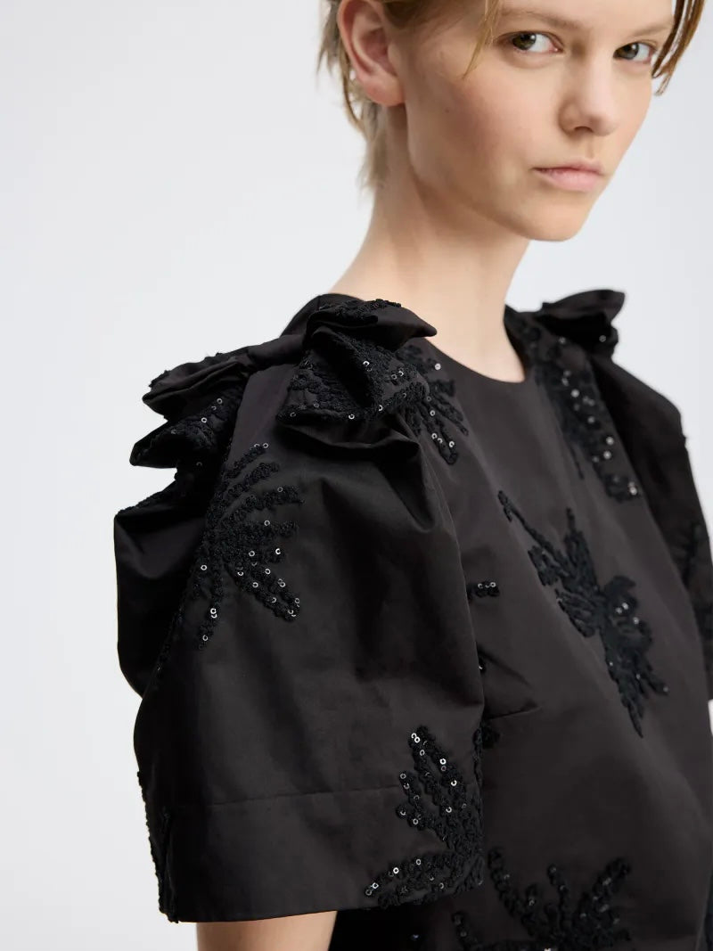 Elegant svart bluse med korte, vide ermer og dekorativt paljettbroderi ton i ton.