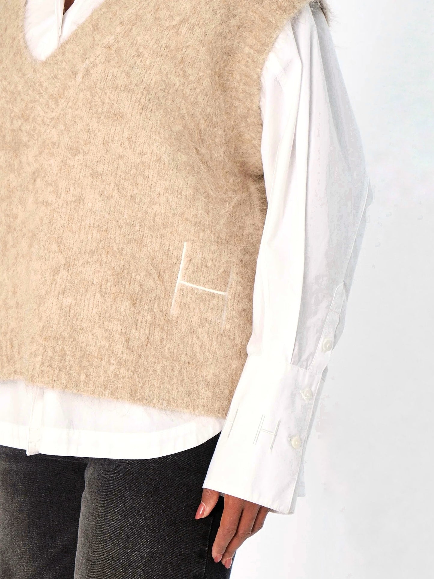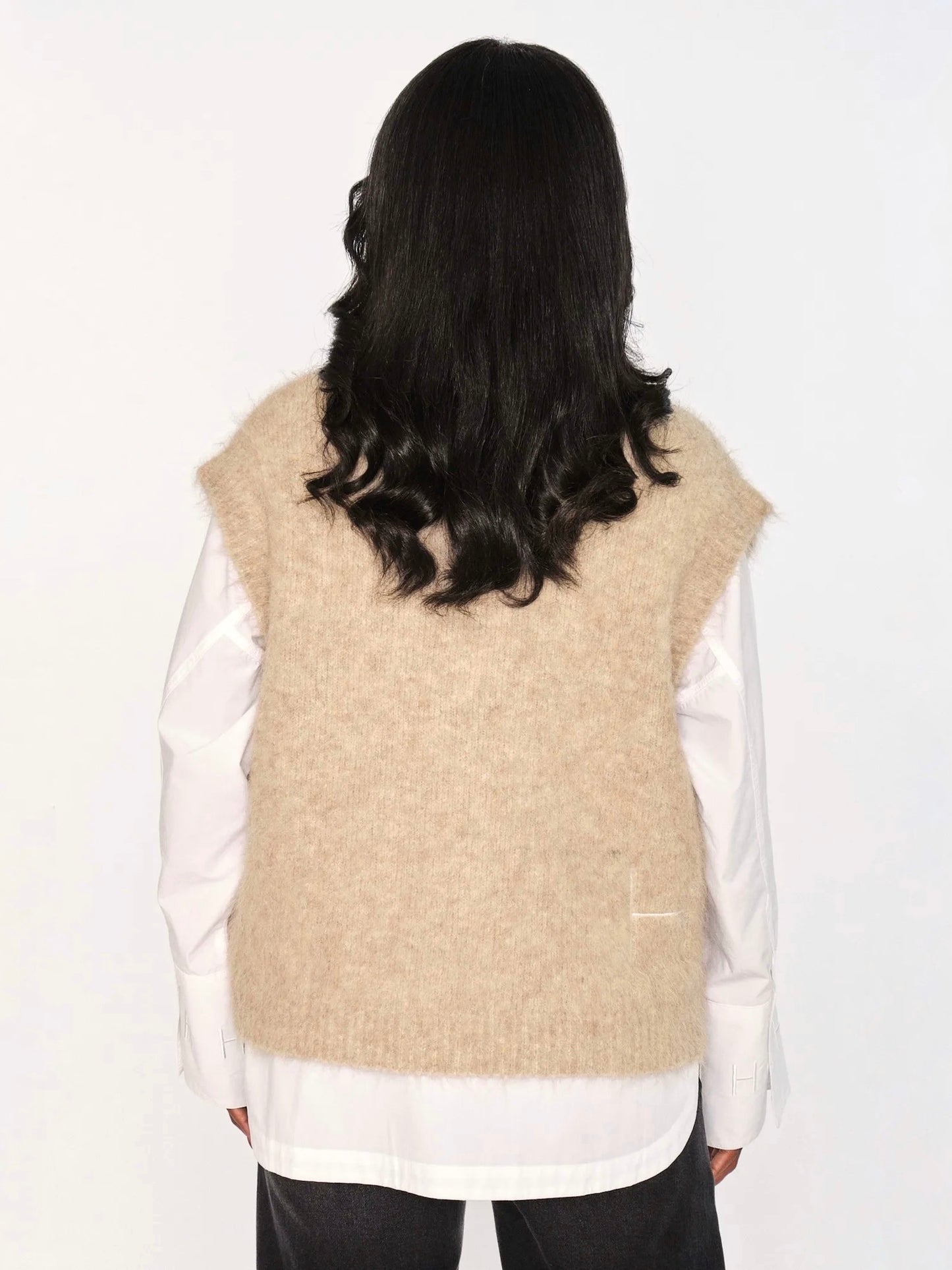 Pernille Vest Savannah Tan fra Hést. Denne avslappede vesten med V-hals er laget i en myk alpakka-blanding for en lun og behagelig følelse. Ribbestruktur og rå kanter gir et moderne og teksturert uttrykk. Et stilrent lag-på-lag-plagg som tilfører antrekket en oppdatert edge.