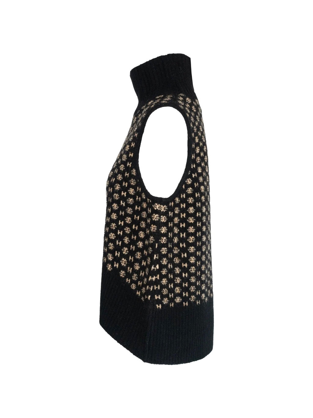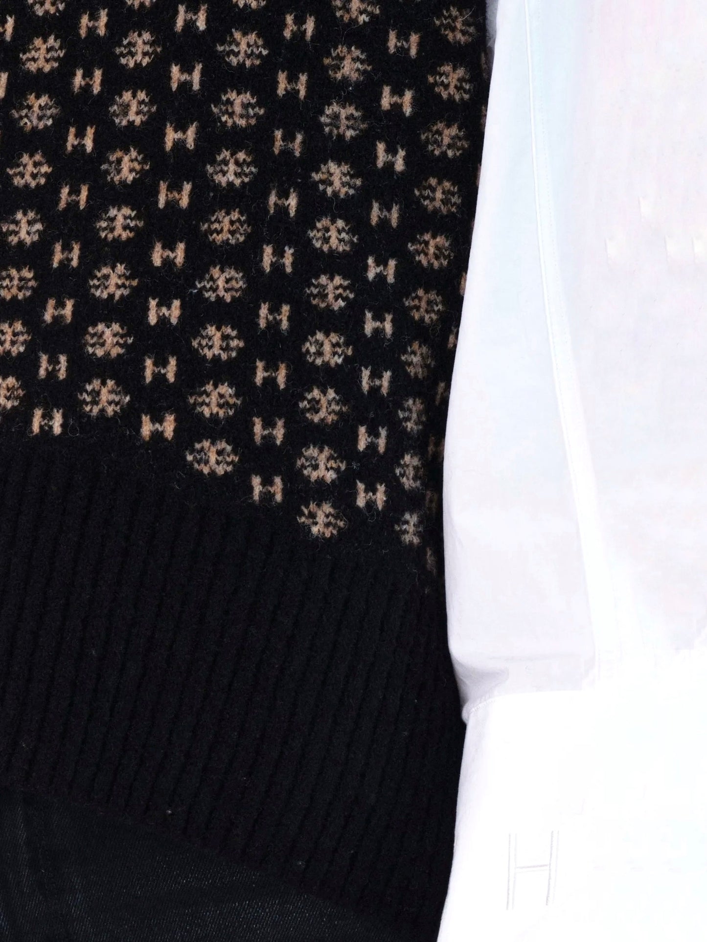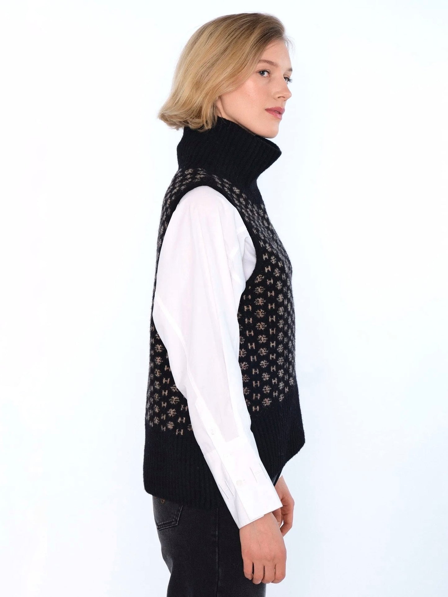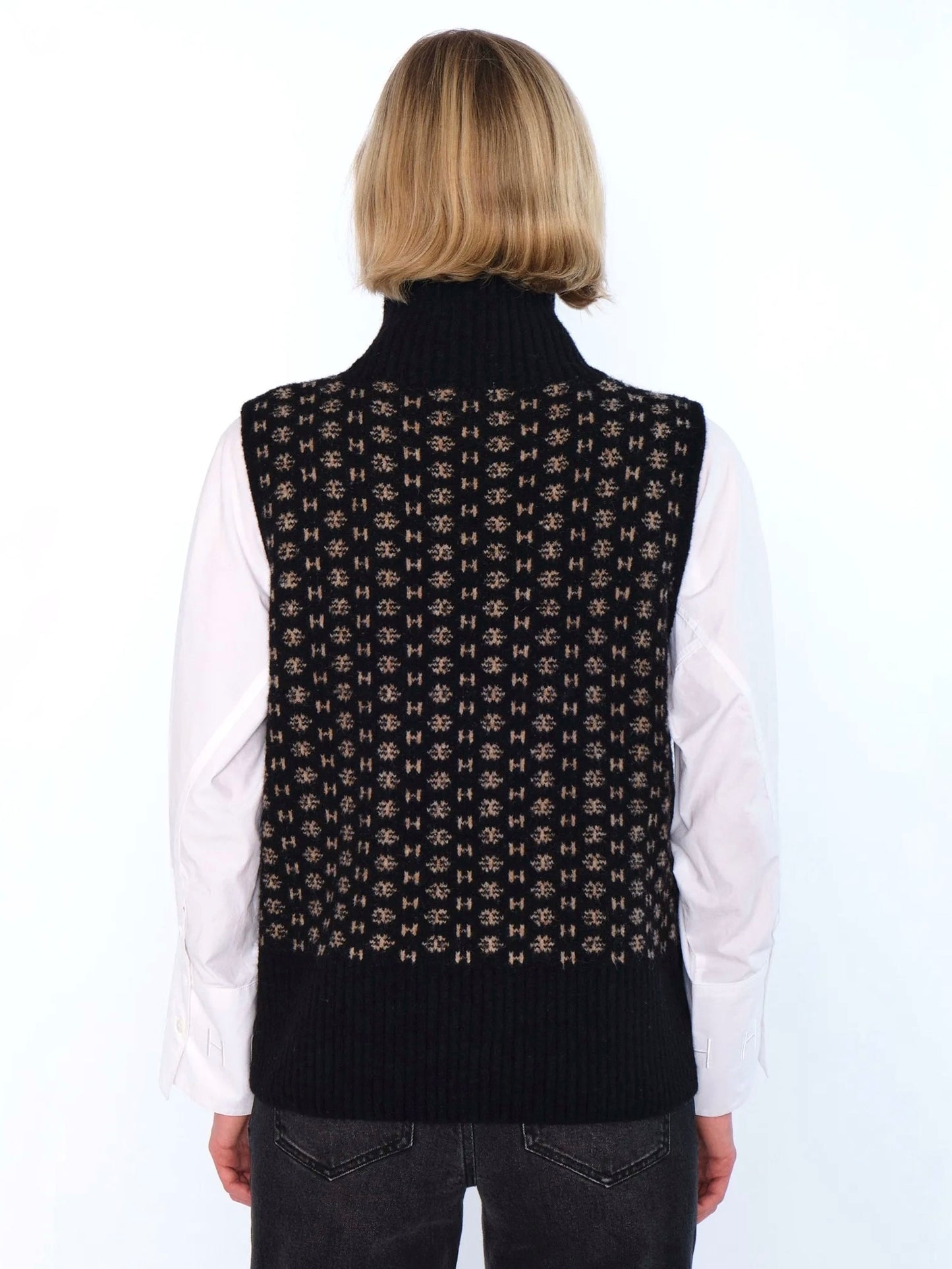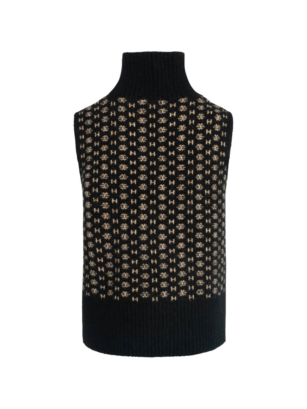 Logo Vest Jet Black fra Hést. En moderne strikkevest med høy hals og et klassisk mønster av HÉST-logoen i kontrastfarger. Logo Vest har en rett, noe kort passform som gjør den ideell til å bæres over skjorter, kjoler eller tynne gensere. Den ribbestrikkede halsen og kanten nederst gir et rent og strukturert uttrykk, mens ullblandingen holder deg varm gjennom sesongen.