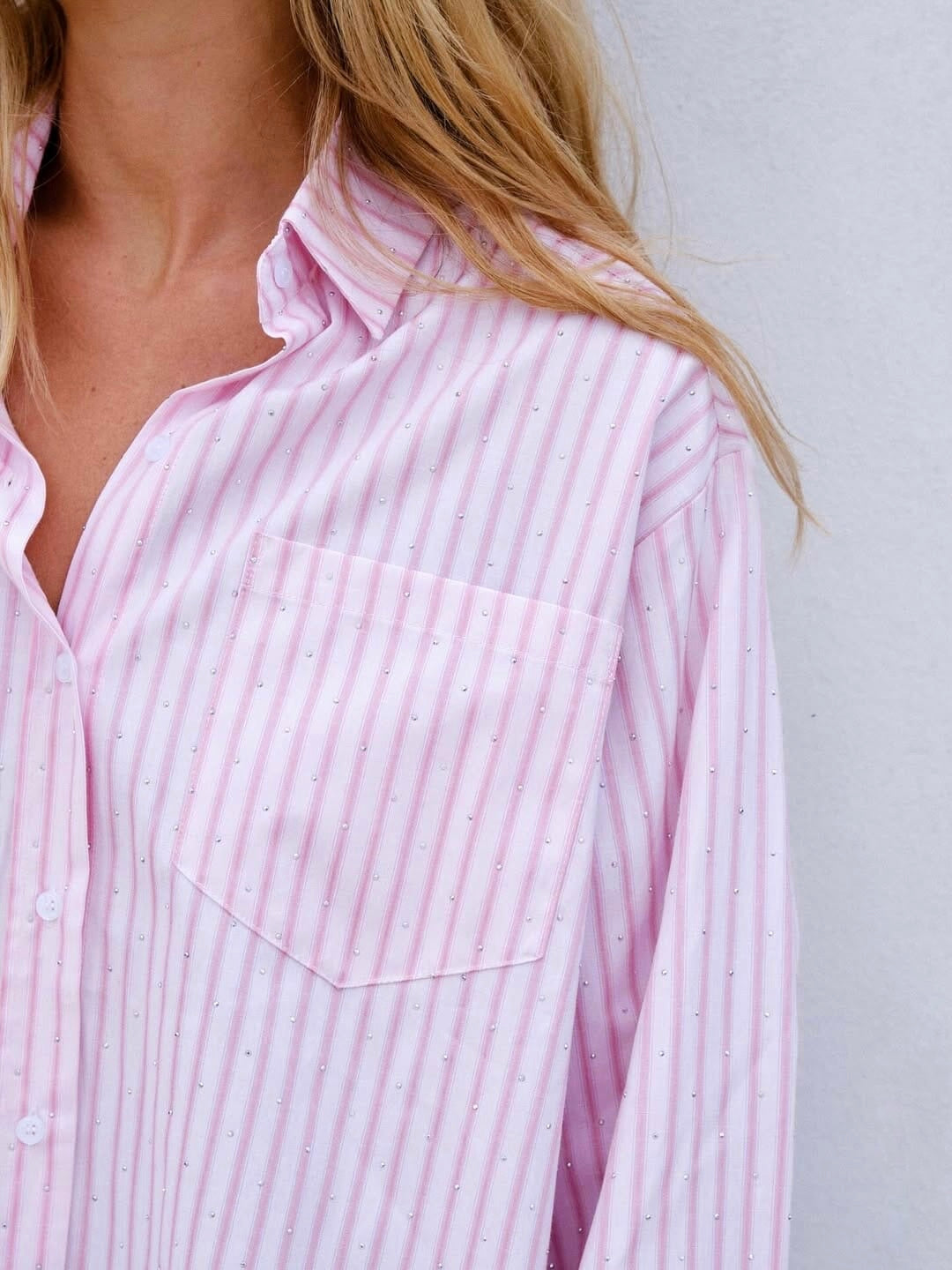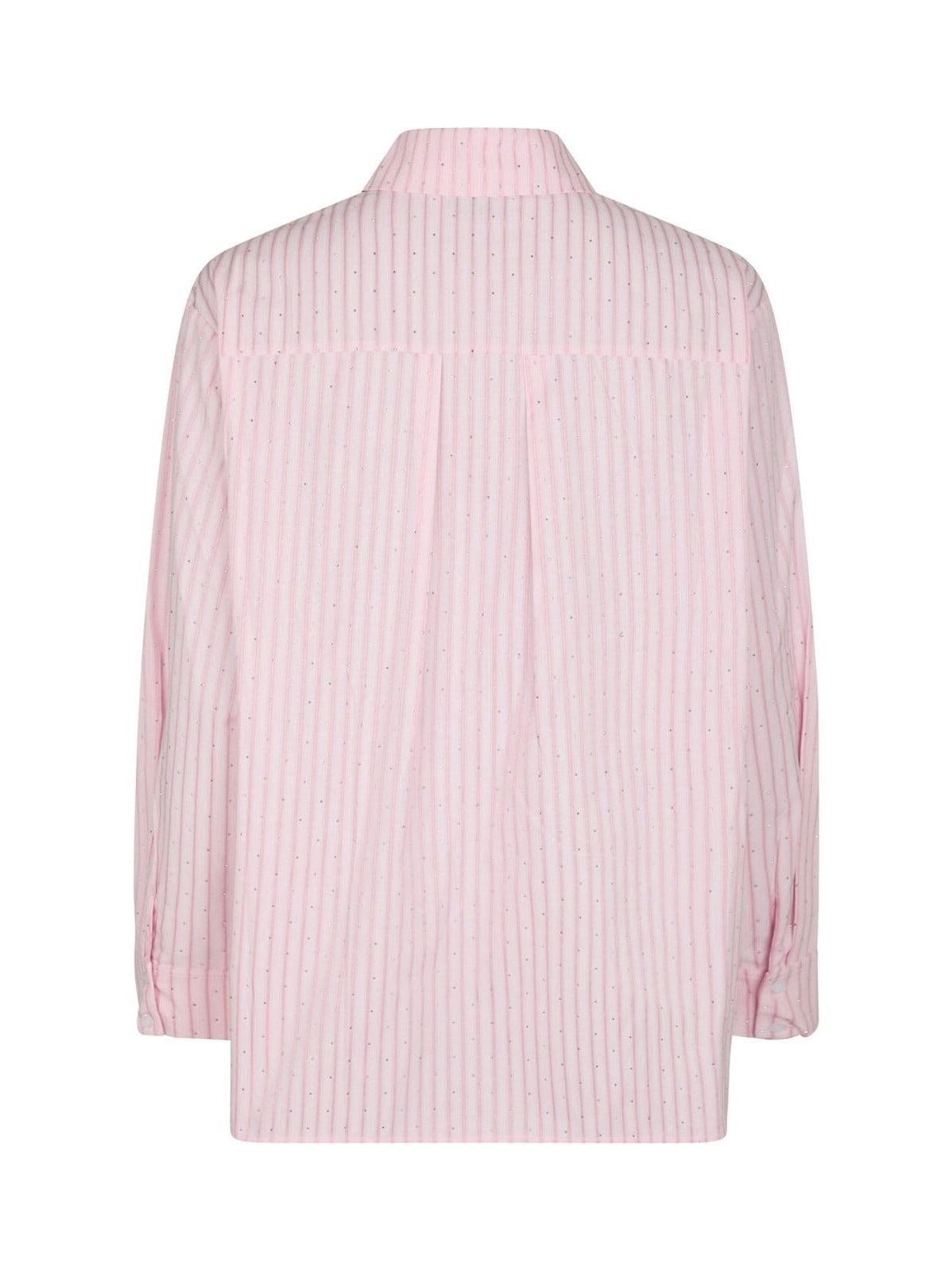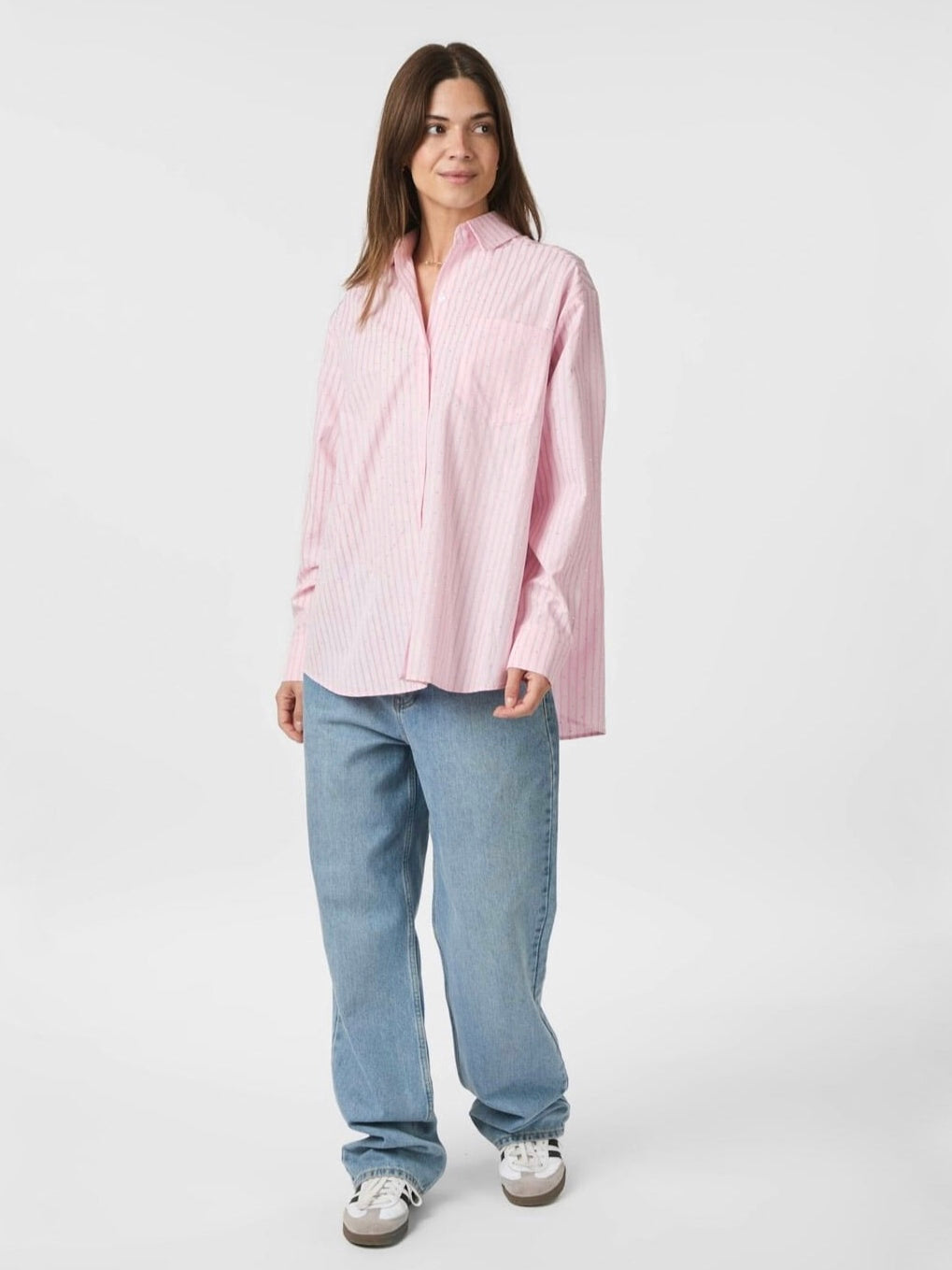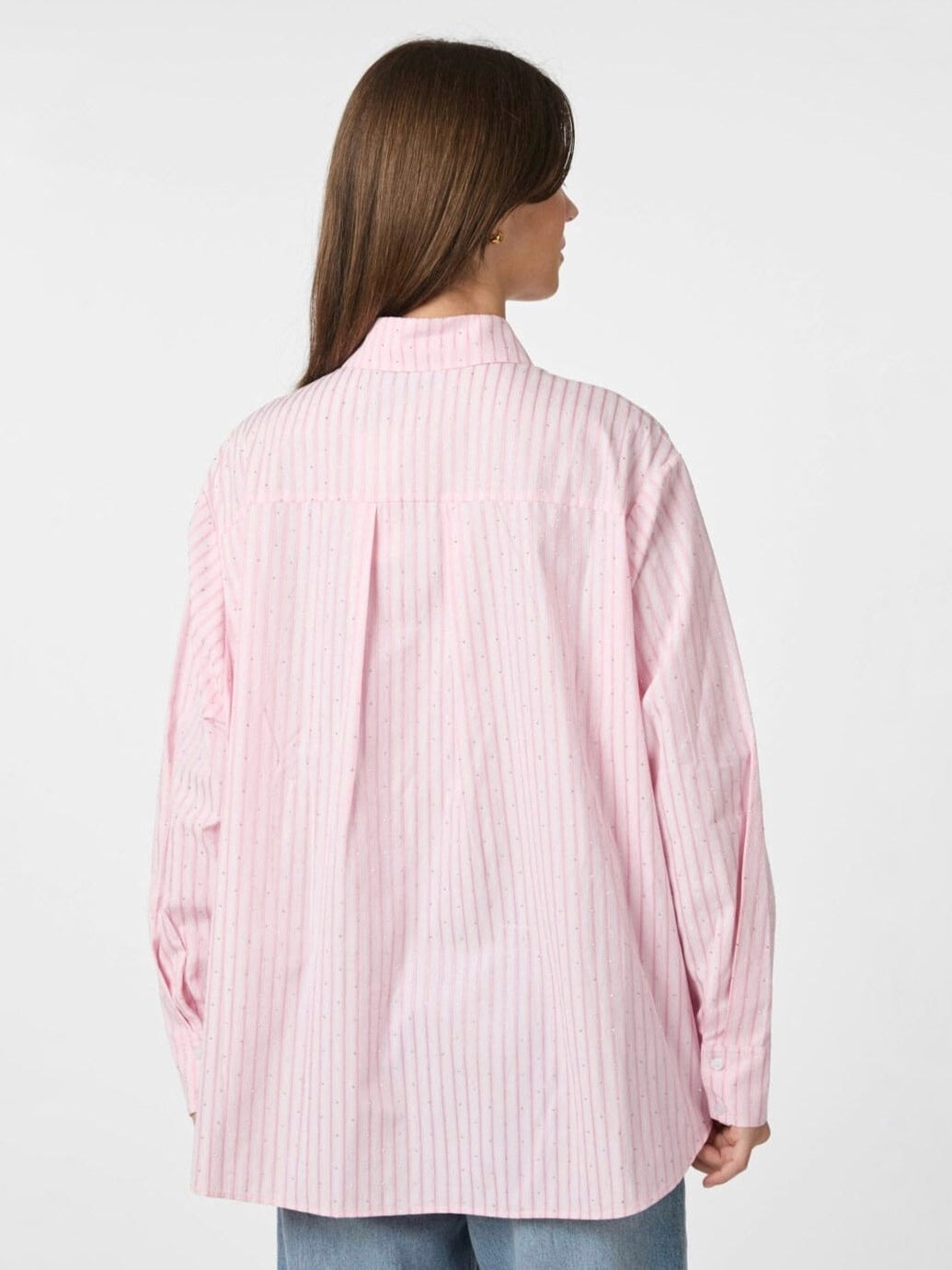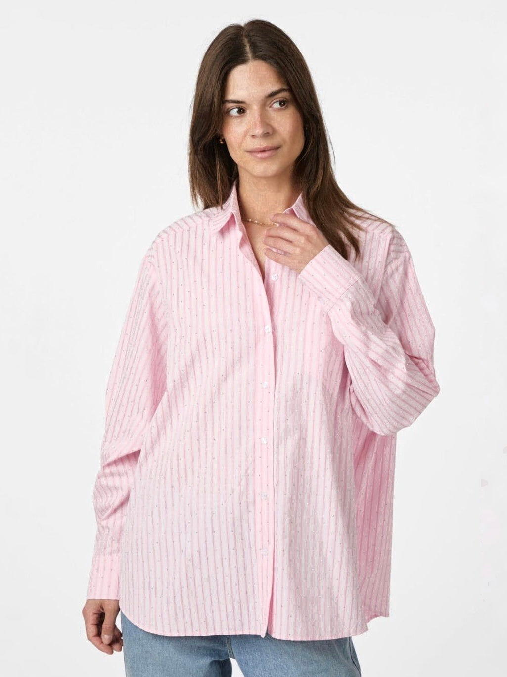 Dalma Soft Stripe Stone Shirt fra Neo Noir. It’s back! 💕 Denne rålekre skjorta er en favoritt hos mange! Kul skjorte i crispy poplinkvalitet med ton-i-ton striper i en nydelig rosafarge. Designet med klassisk krage, lange ermer med mansjetter, brystlomme og små rhinestones som gir et delikat, feminint uttrykk. Oversized og avslappet passform med fin lengde. Lukkes med knapper hele veien ned i front.