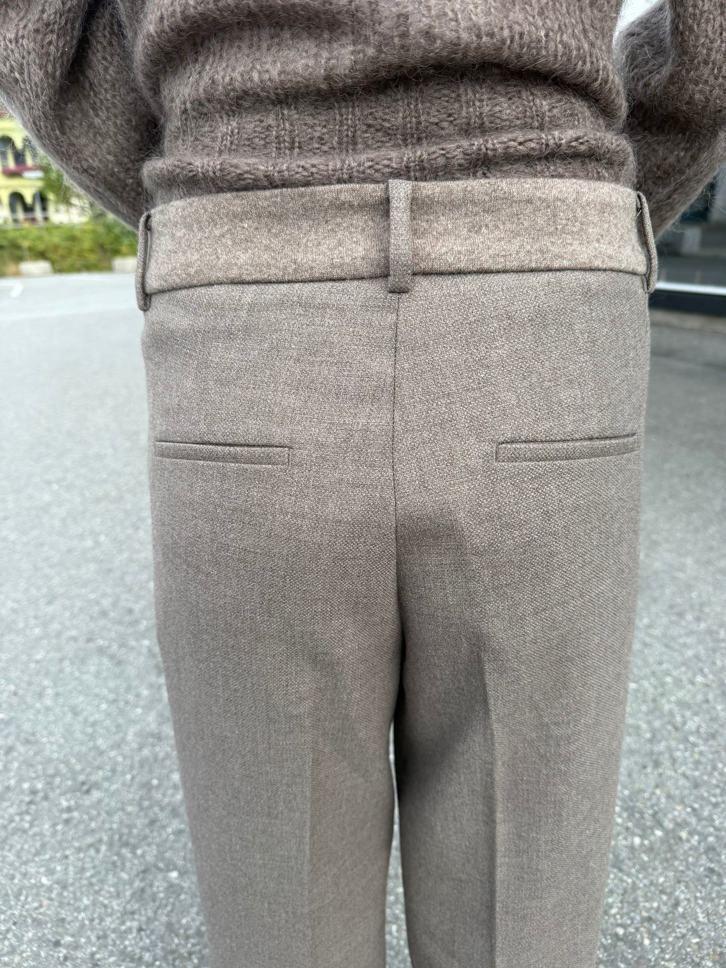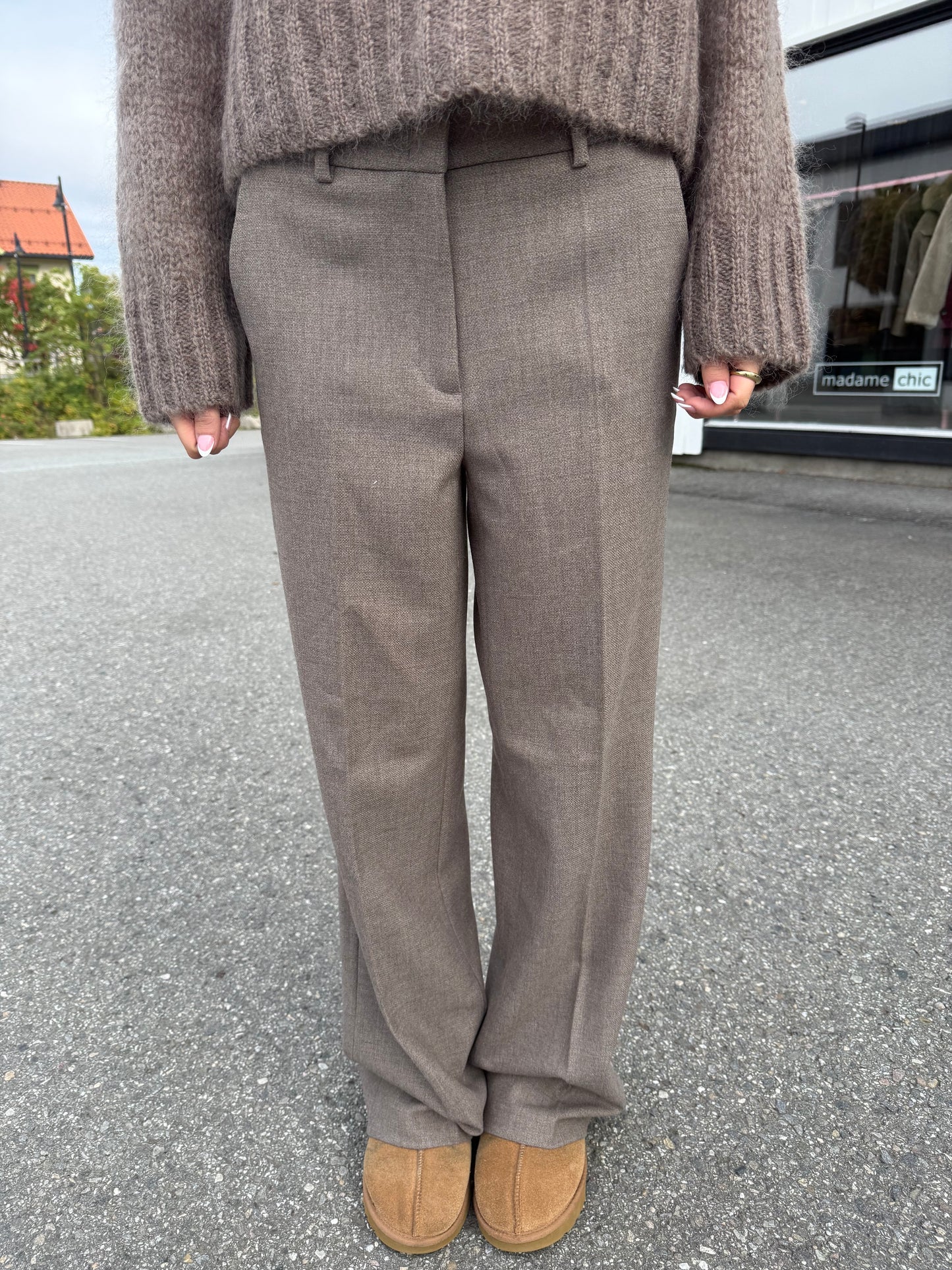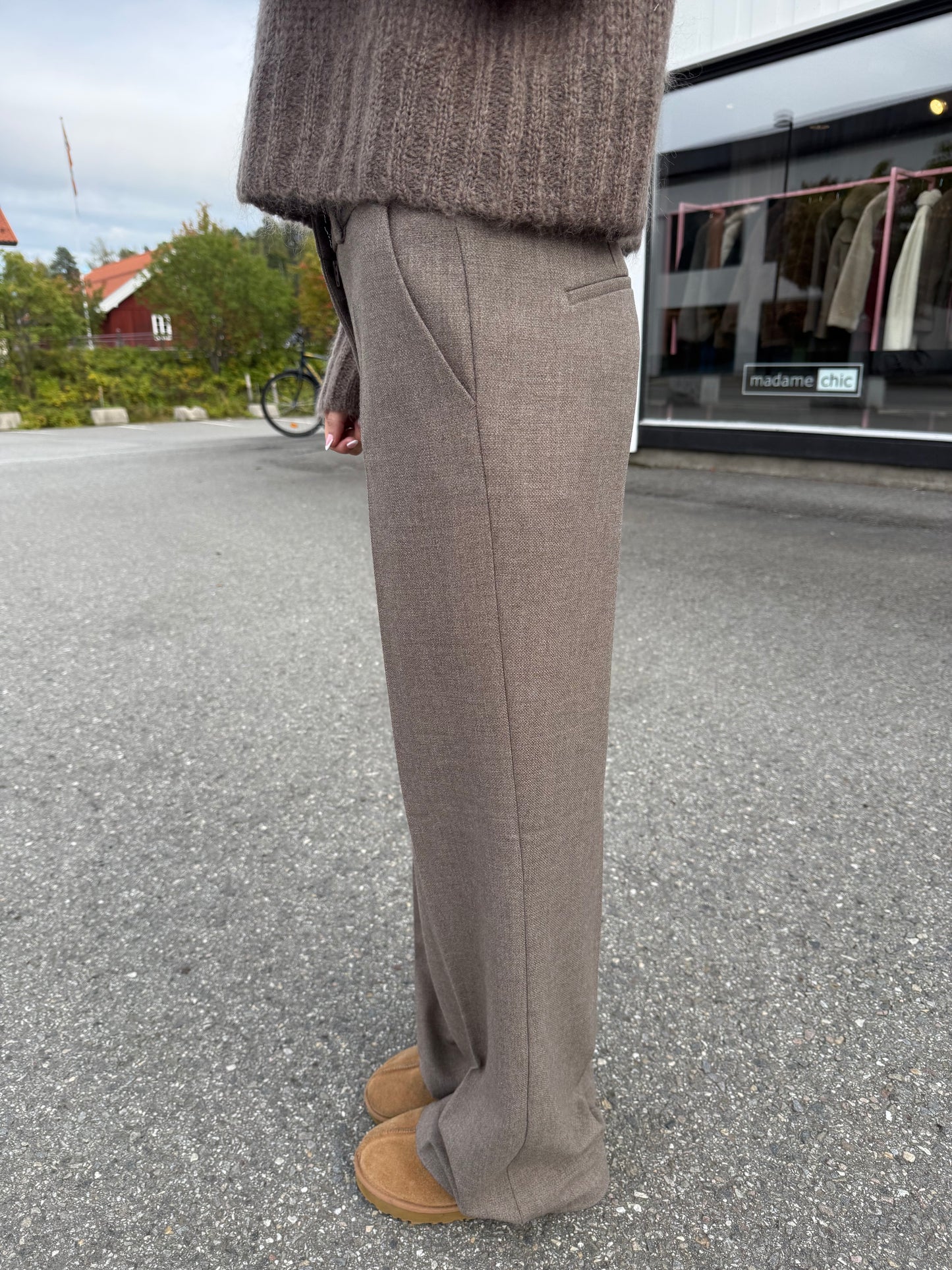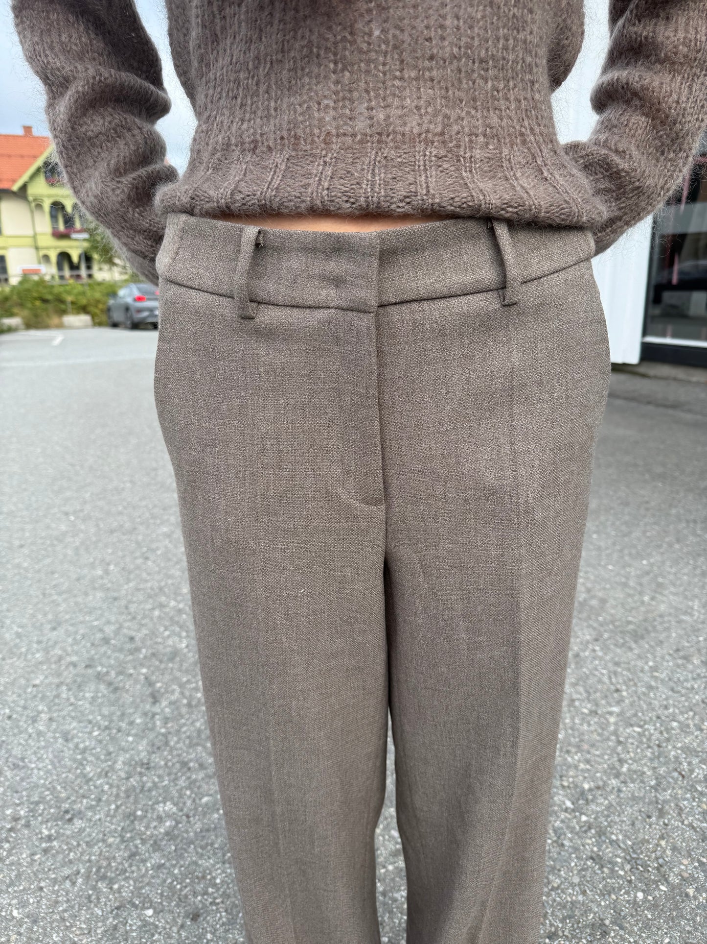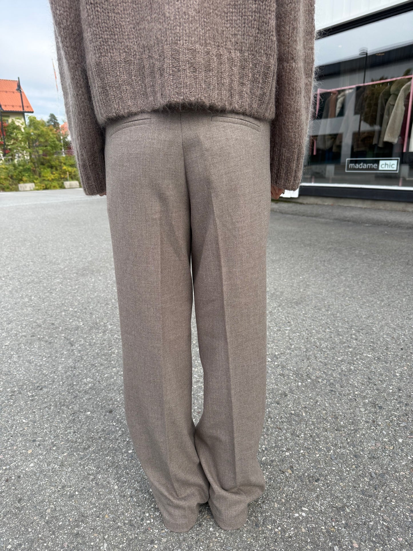 Amelie fra Cambio er en elegant bukse med høyt liv og utsvingte, rette ben. Den har beltehemper, glidelåslukking og skrålommer i sidene, og kombinerer komfort med en flatterende passform.